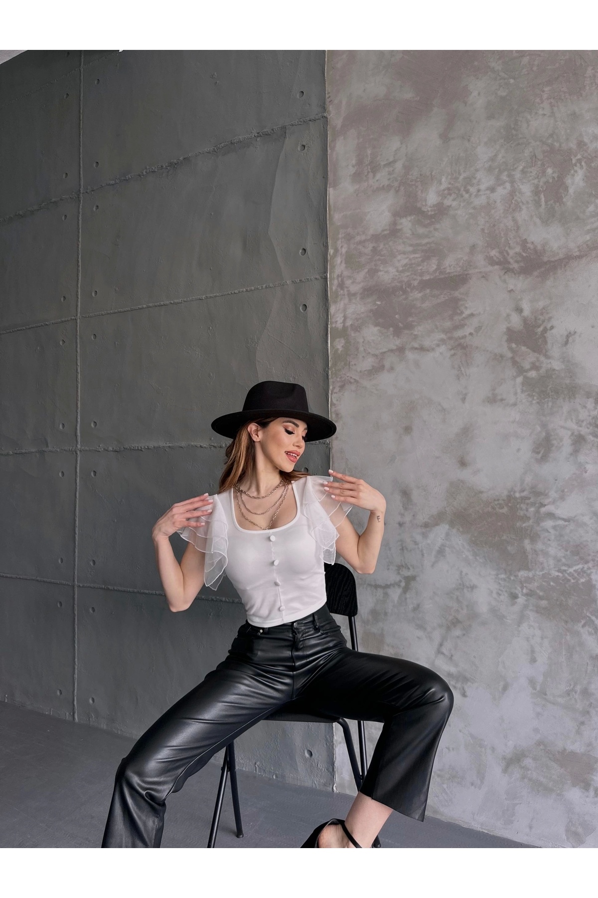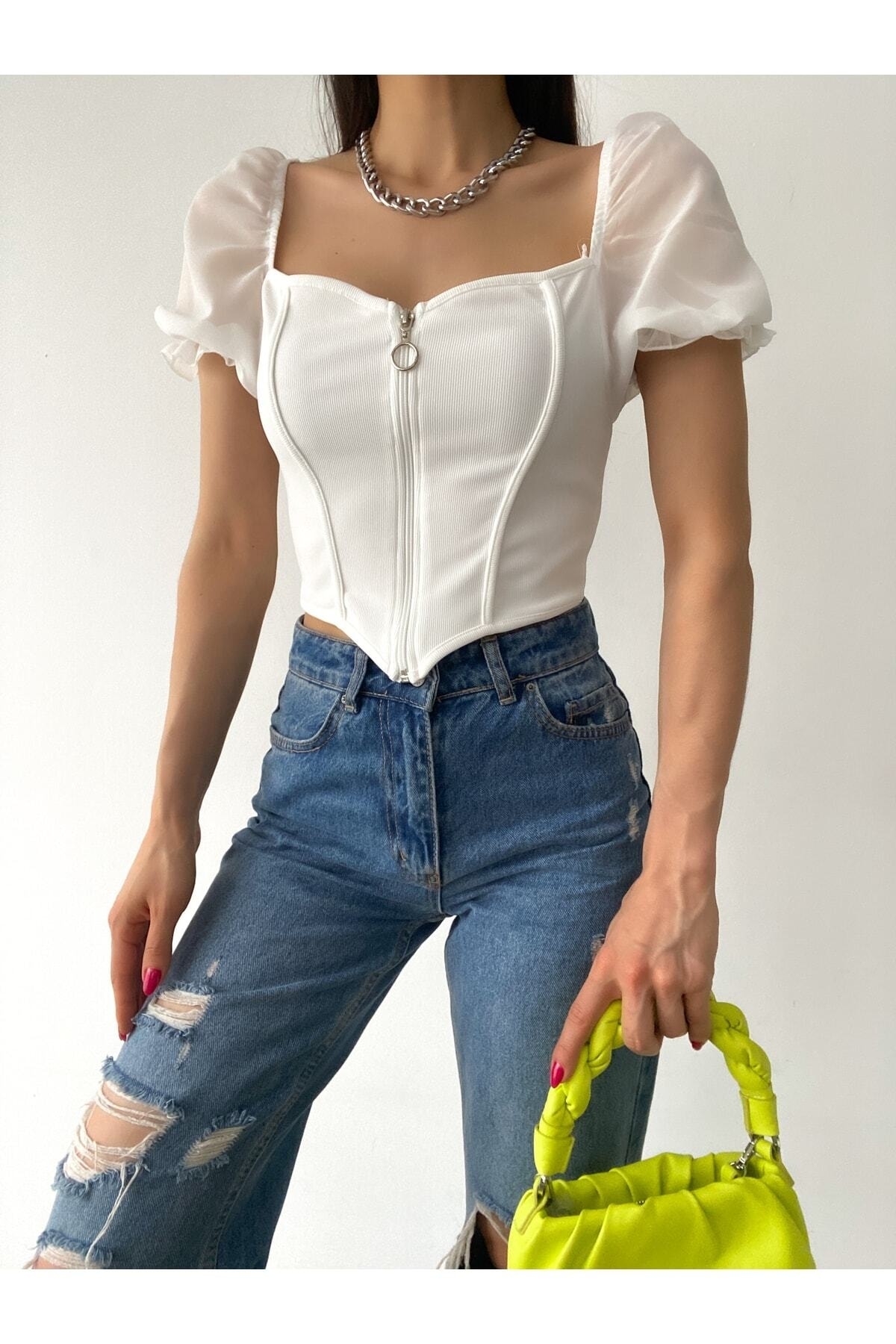 Omuzu Tüllü Düğme Detaylı Crep Bluz Omuzu Tüllü Düğme Detaylı Crep Bluz tüllübluz01 0