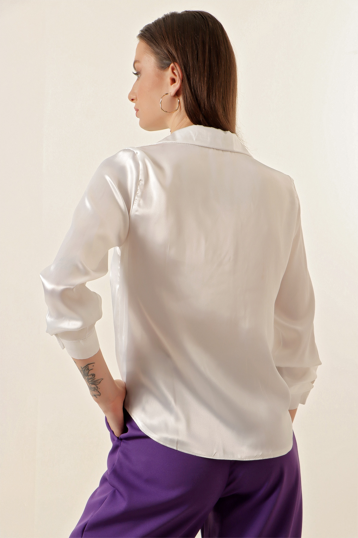 Önü büzgülü yakalı beyaz saten gömlek Önü büzgülü yakalı beyaz saten gömlek 53636l 42