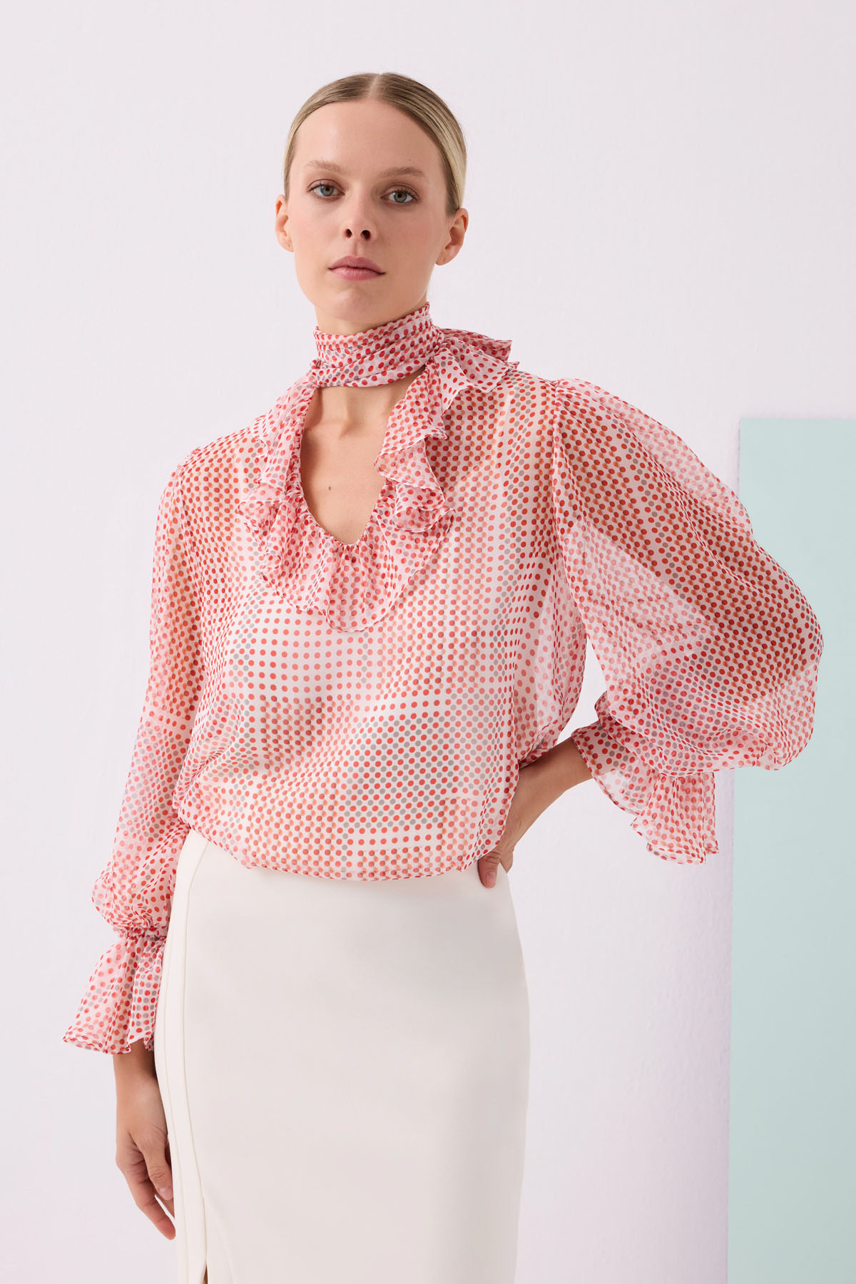 SİYAH BEYAZ PUANTİYELİ DİK YAKA BAĞLAMALI BLUZ SİYAH BEYAZ PUANTİYELİ DİK YAKA BAĞLAMALI BLUZ M23KJP040046_A04 40