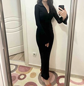 Kadın Siyah Maxi Elbise Gizli Fermuarlı Yakalı Kol Ağzı Yırtmaçlı İpek Jarse Elbise Kadın Siyah Maxi Elbise Gizli Fermuarlı Yakalı Kol Ağzı Yırtmaçlı İpek Jarse Elbise Zagrep1300 L