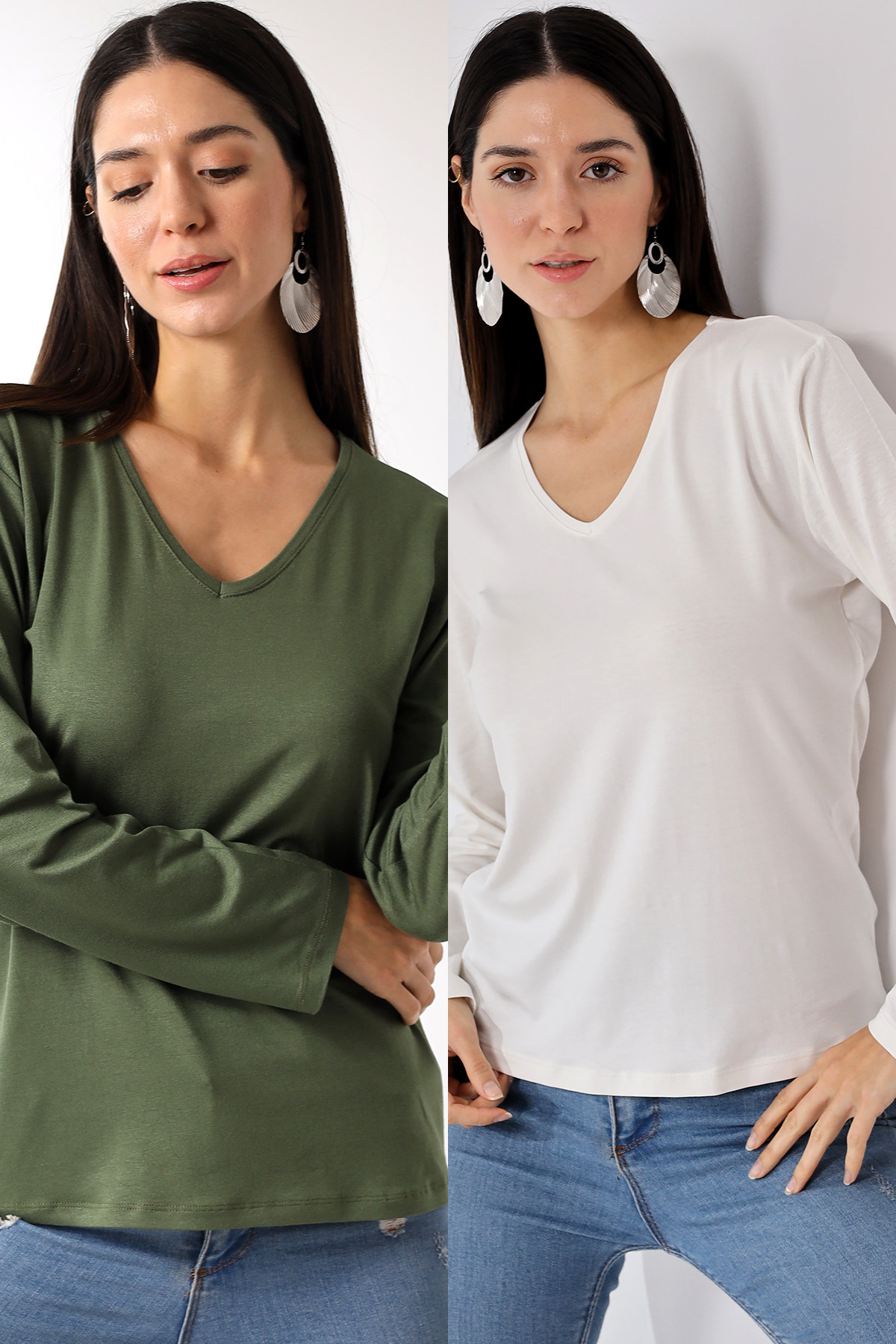 Kadın V Yaka Oversize Basic Uzun Kollu T-Shirt Saks Mavi Kadın V Yaka Oversize Basic Uzun Kollu T-Shirt Saks Mavi DVKA-0834 Standart