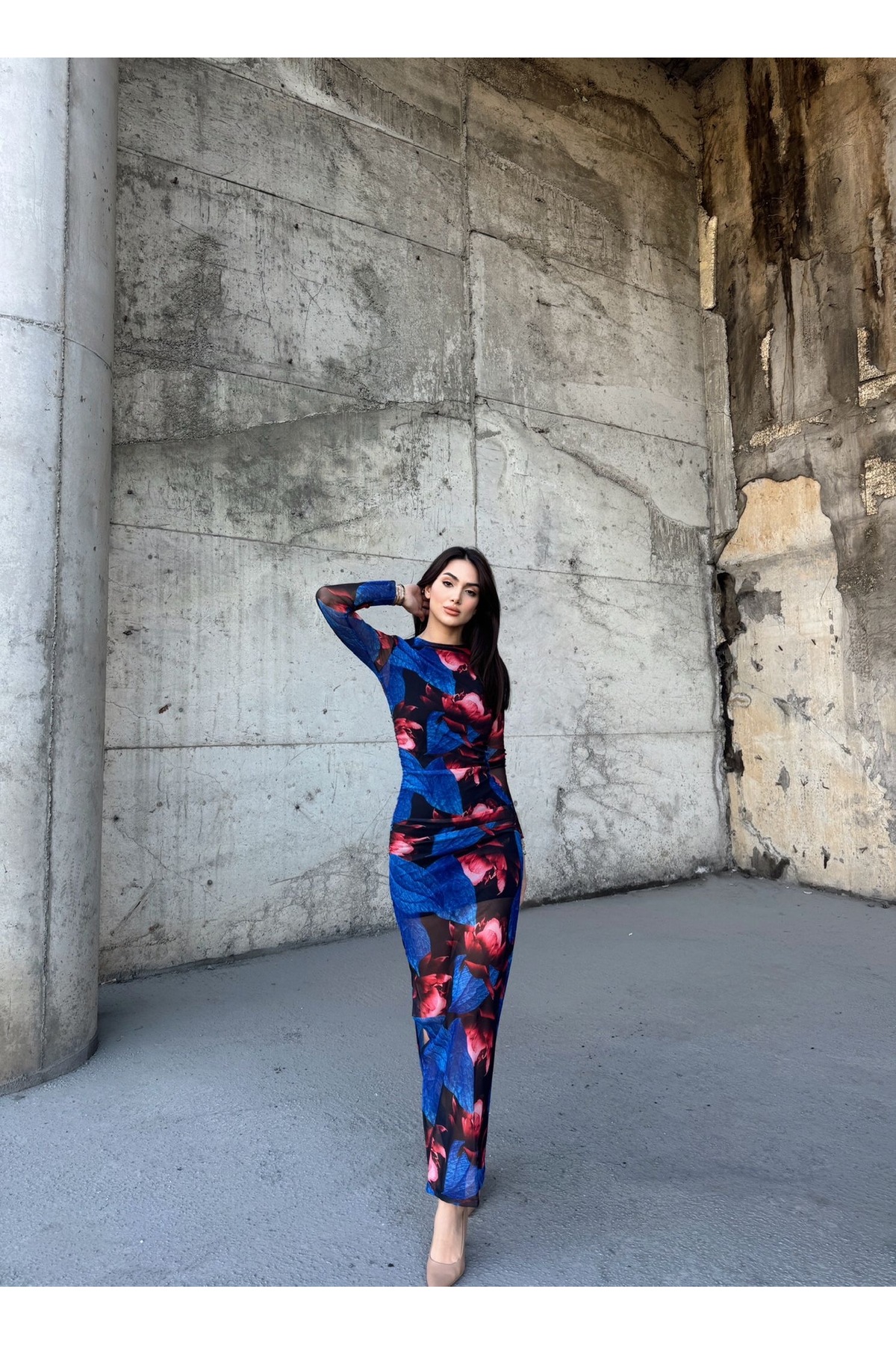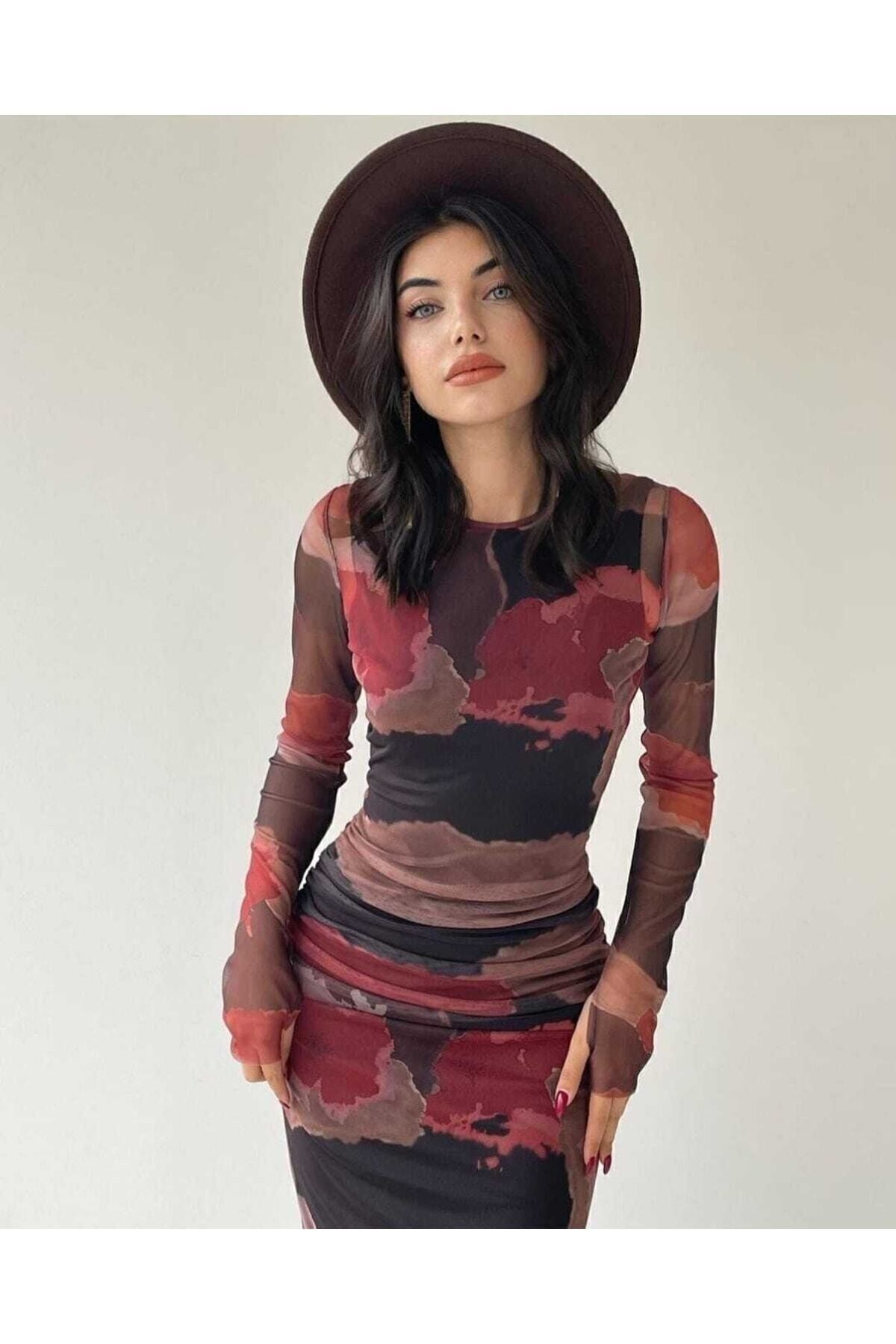Kadın Büzgü Detay Desenli Tül Midi Elbise Kadın Büzgü Detay Desenli Tül Midi Elbise ELB55 L