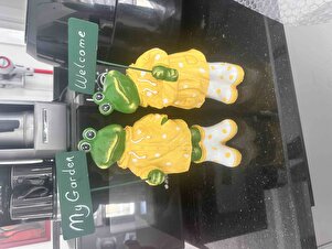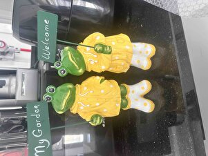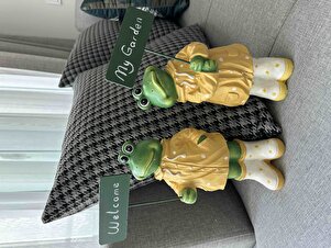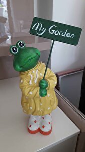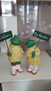 Kurbağa set yağmurluklu tabela tutan heykel biblo bahçe balkon dekor Kurbağa set yağmurluklu tabela tutan heykel biblo bahçe balkon dekor kurbağacift تک سایز