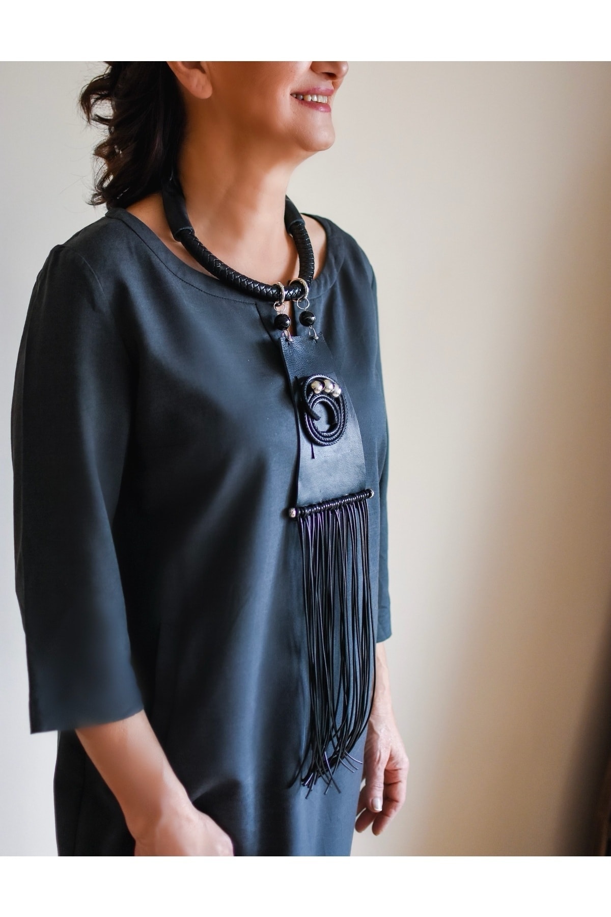 Gümüş Yuvarlak ve Boncuk Detaylı Siyah Deri Kolye Gümüş Yuvarlak ve Boncuk Detaylı Siyah Deri Kolye KU30001 تک سایز