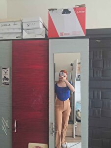 Kadın Saks Kare Yaka Balon Kol Dalgıç Kumaş Şeritli Kadın Bluz Kadın Saks Kare Yaka Balon Kol Dalgıç Kumaş Şeritli Kadın Bluz QTT116 L