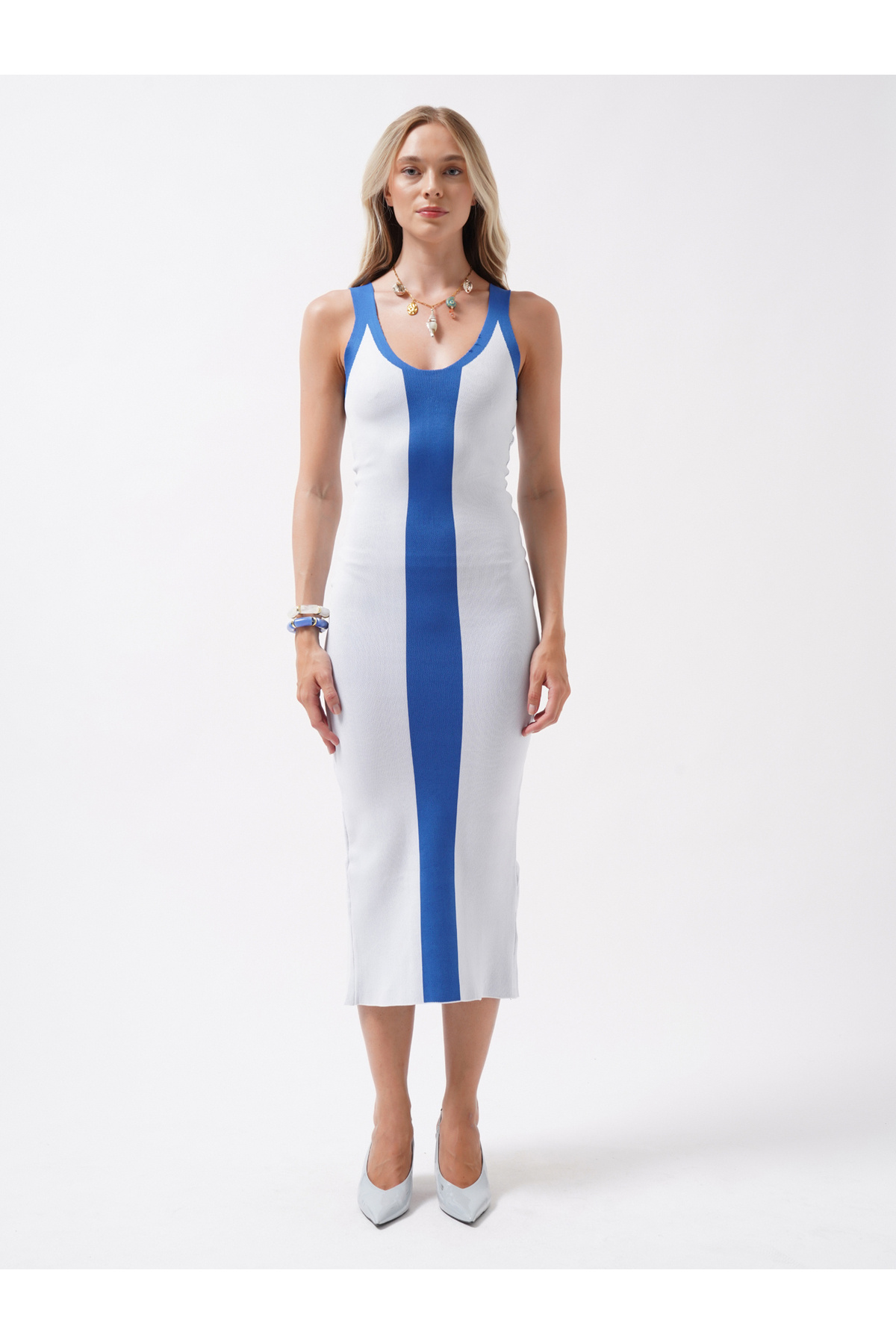Çift Renk Yırtmaç Detay Beyaz Saks Elbise Çift Renk Yırtmaç Detay Beyaz Saks Elbise 23S25005 L