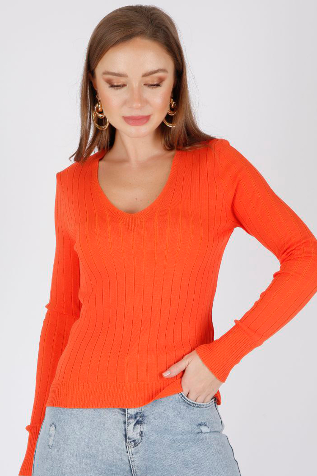 V Yaka Uzun Kollu Fitilli Düz Renk Fit Kesim Yazlık Esnek Triko Bluz V Yaka Uzun Kollu Fitilli Düz Renk Fit Kesim Yazlık Esnek Triko Bluz ALCH-00056 Standart