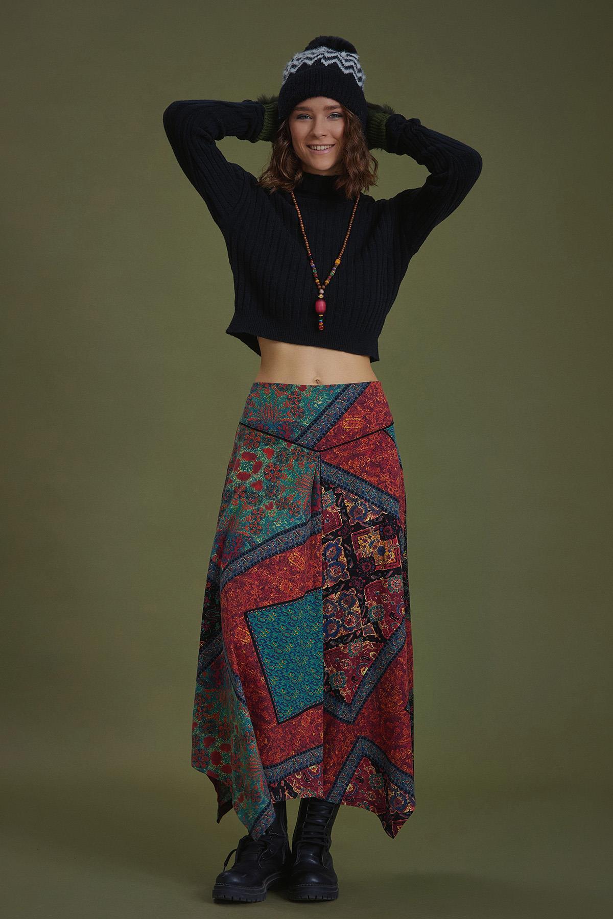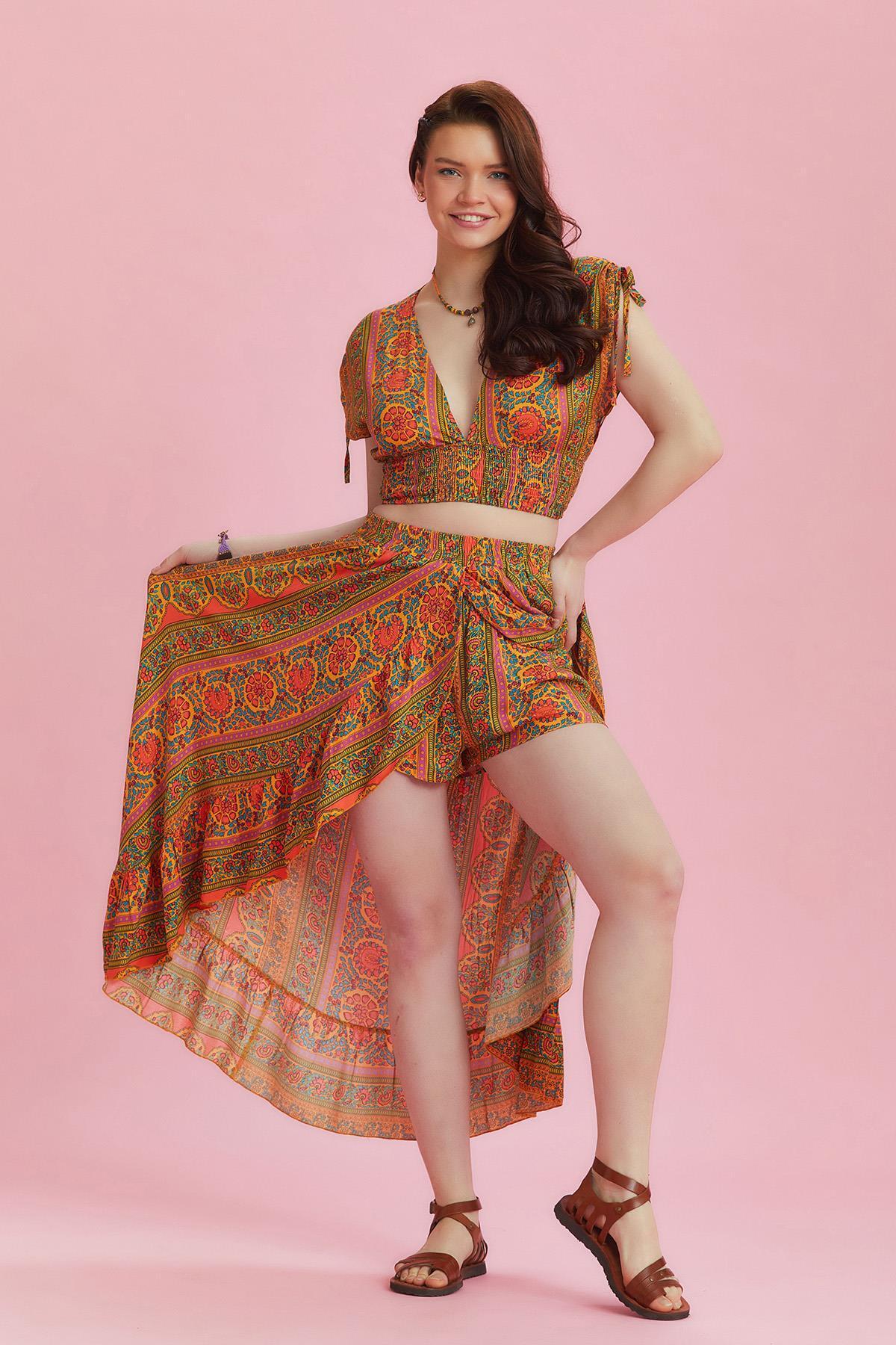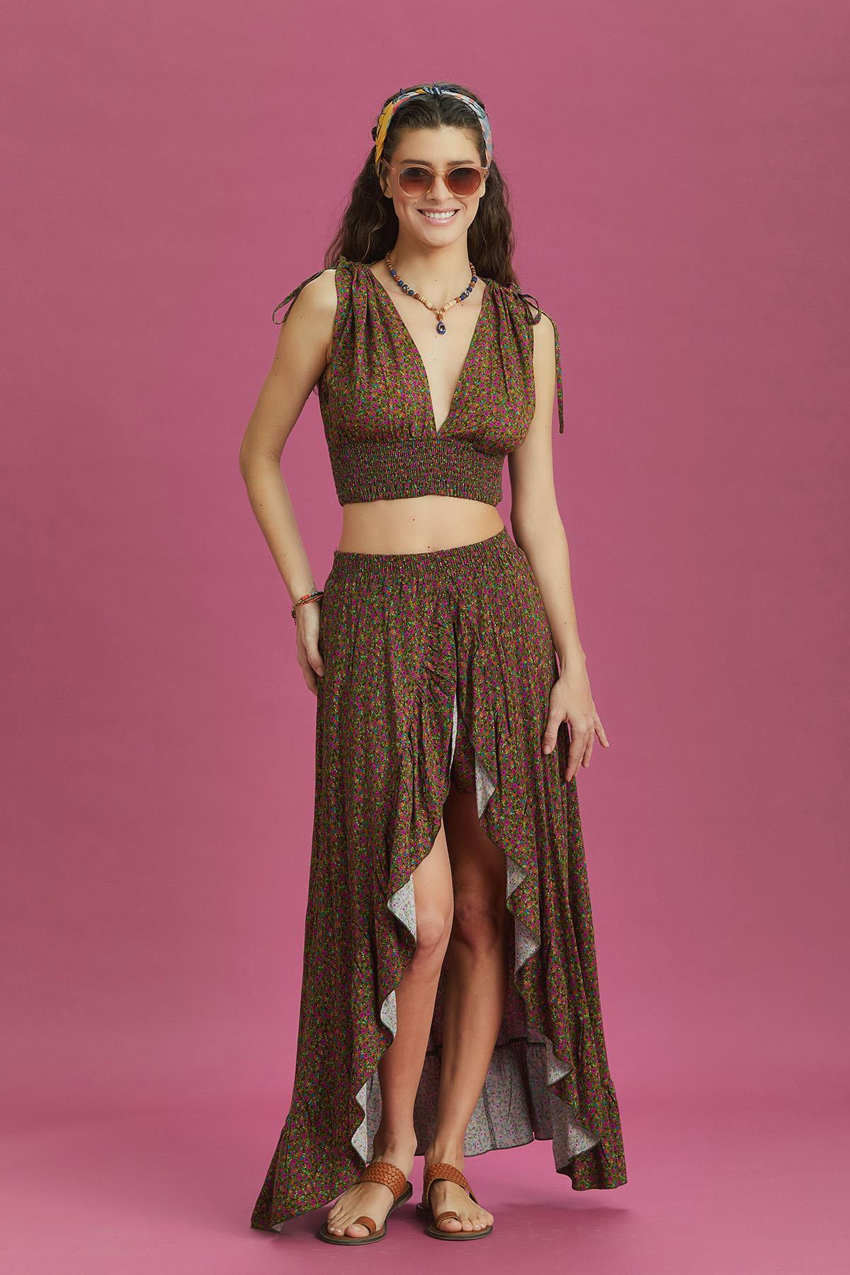 Derin Ön Yırtmaçlı Fırfırlı Çiçekli Çingene Etek Derin Ön Yırtmaçlı Fırfırlı Çiçekli Çingene Etek ULOS23FWSKRW.001_161 L/XL