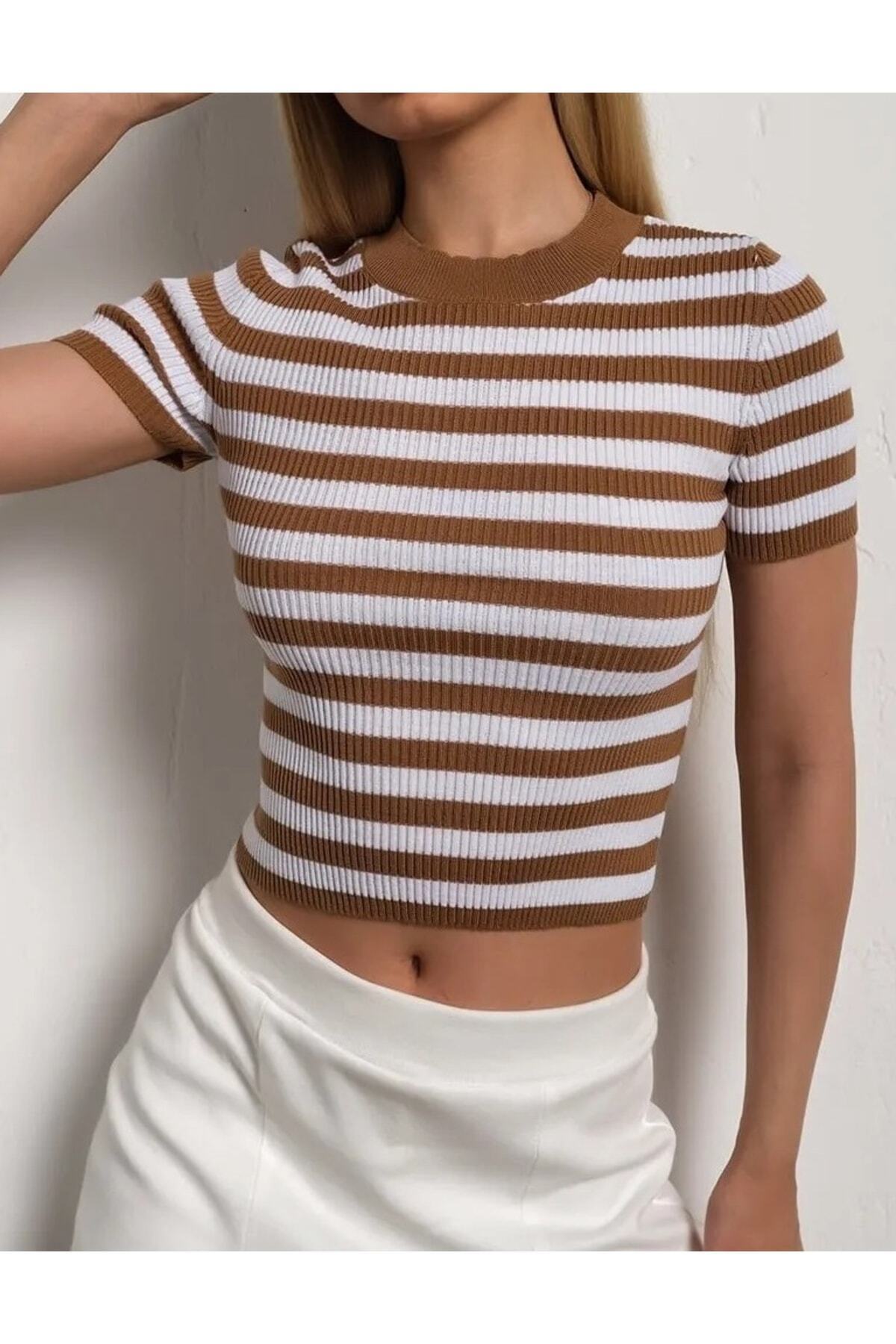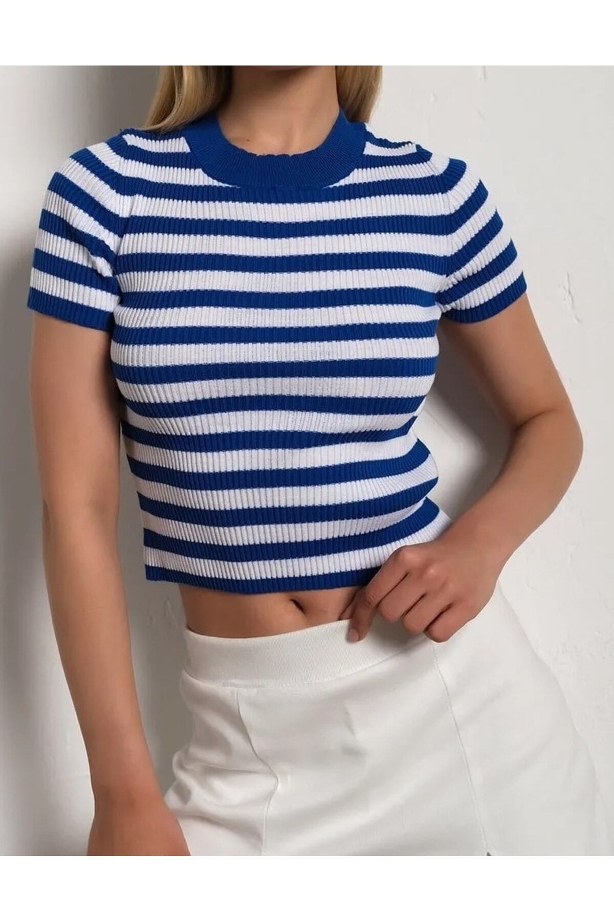 Kadın Çizgili Kısa Kol Bisiklet Yaka Saks Bluz Kadın Çizgili Kısa Kol Bisiklet Yaka Saks Bluz 22247 2XL