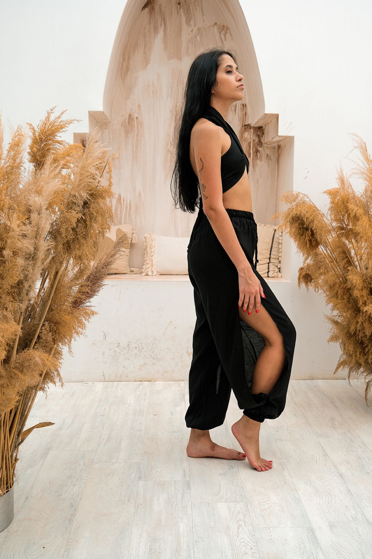 Siyah Viskon Beli Lastikli Yandan Yırtmaçlı Dökümlü Şalvar Pantolon Kadın Günlük Bohem Tarz Siyah Viskon Beli Lastikli Yandan Yırtmaçlı Dökümlü Şalvar Pantolon Kadın Günlük Bohem Tarz BY0820-PLN M