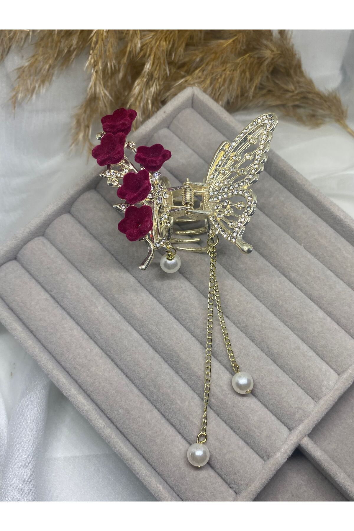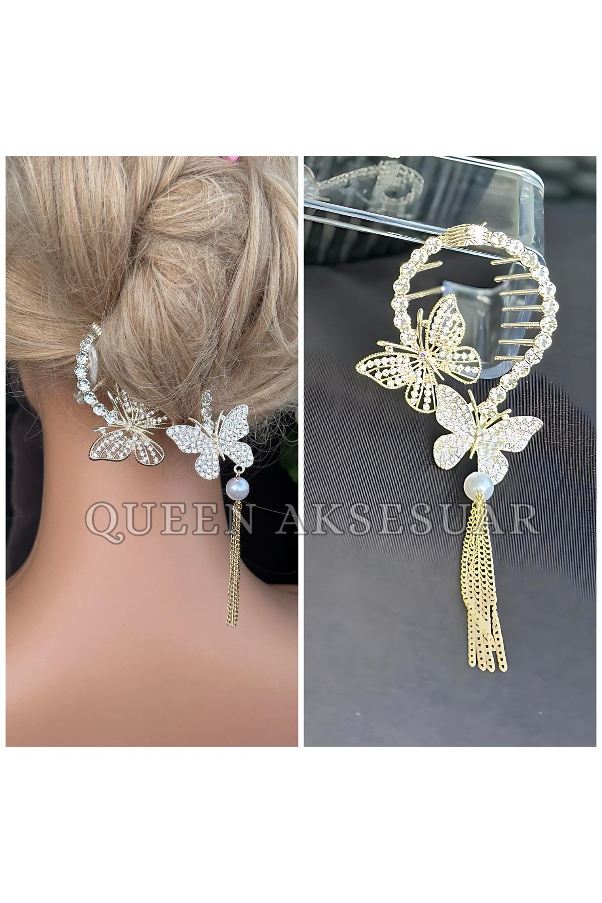 Zincirli incili sallantılı gold metal topuz tokası Zincirli incili sallantılı gold metal topuz tokası ZAZISGMTT تک سایز
