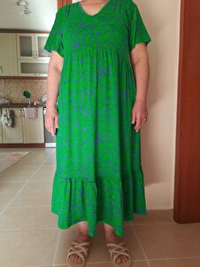 Kadın Yeşil Çiçek Desen V yaka Kısa Kol Robalı Elbise Kadın Yeşil Çiçek Desen V yaka Kısa Kol Robalı Elbise ROB-FIR-CCK 52-54