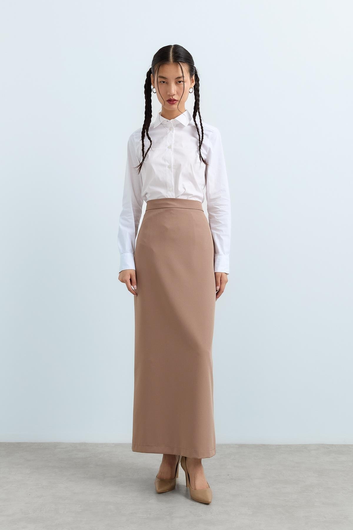 Maxi Boy Arkadan Fermuarlı Yırtmaçlı Vizon Klasik Etek Maxi Boy Arkadan Fermuarlı Yırtmaçlı Vizon Klasik Etek 200001 42