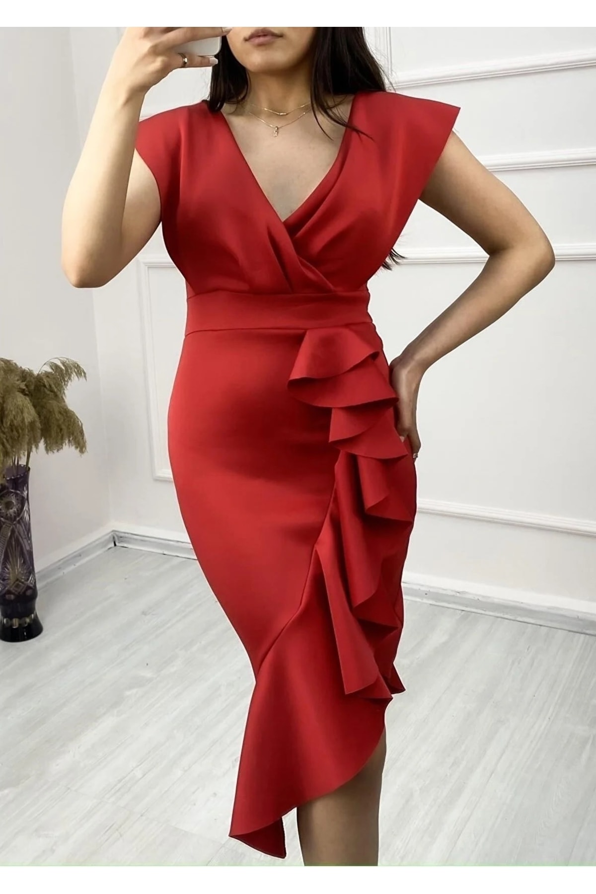 Kadın yaka fırfırlı kuşaklı kırmızı şifon elbise 5000 Kadın yaka fırfırlı kuşaklı kırmızı şifon elbise 5000 TYC5E5F1BE8DD58780 5XL