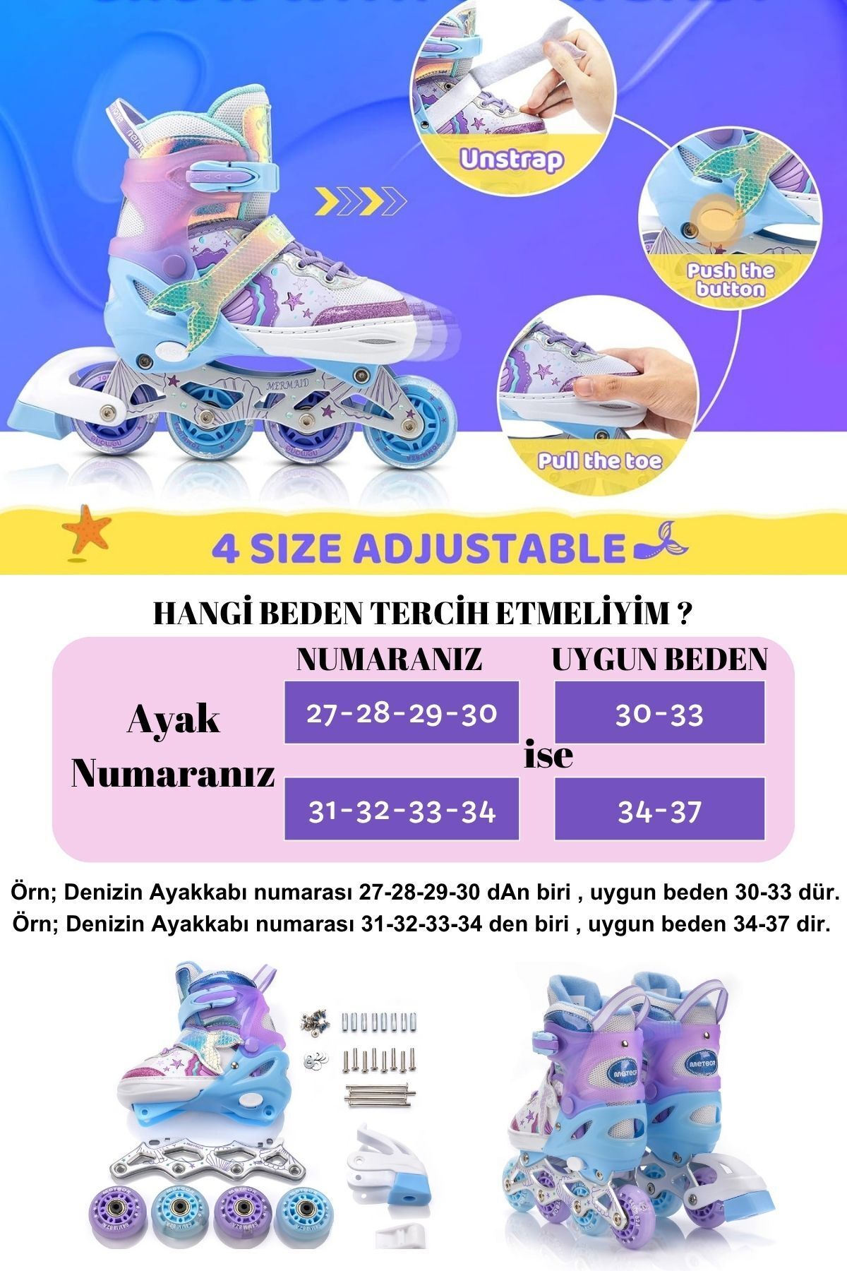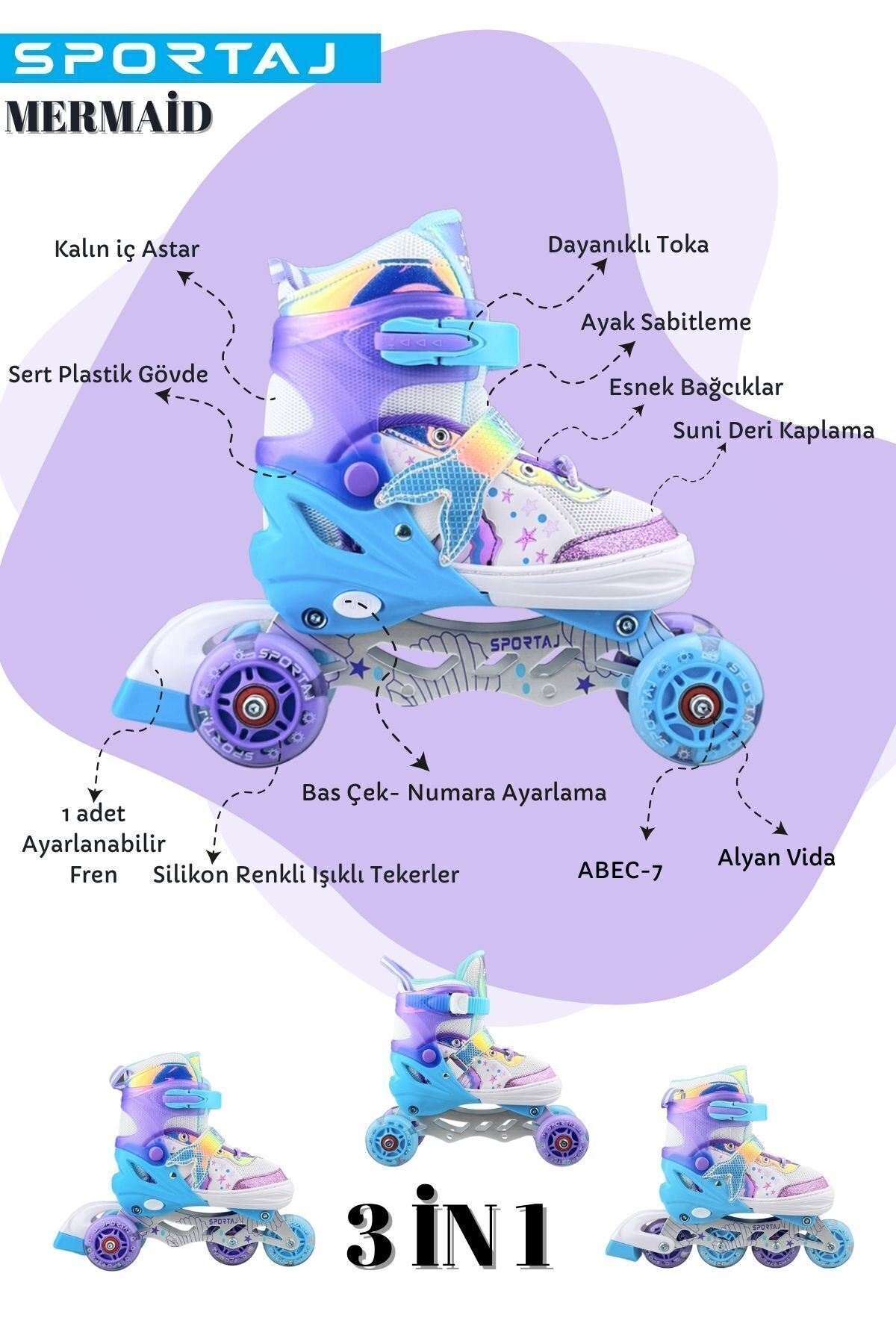 Deniz Kızı Işıklı Paten 2+2 Kız Çocuk Pateni Silikon Teker,Taşıma Çantalı 3 in 1 Teker Deniz Kızı Işıklı Paten 2+2 Kız Çocuk Pateni Silikon Teker,Taşıma Çantalı 3 in 1 Teker 652034 34-37