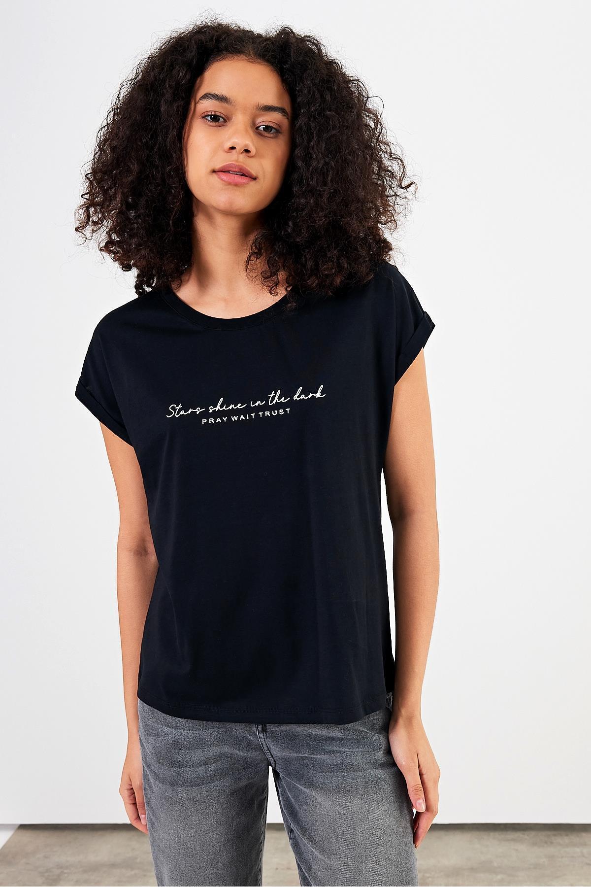 Kadın Shine Siyah Bisiklet Yaka Baskılı Regular Fit Tişört Kadın Shine Siyah Bisiklet Yaka Baskılı Regular Fit Tişört 2Y24200887 XL