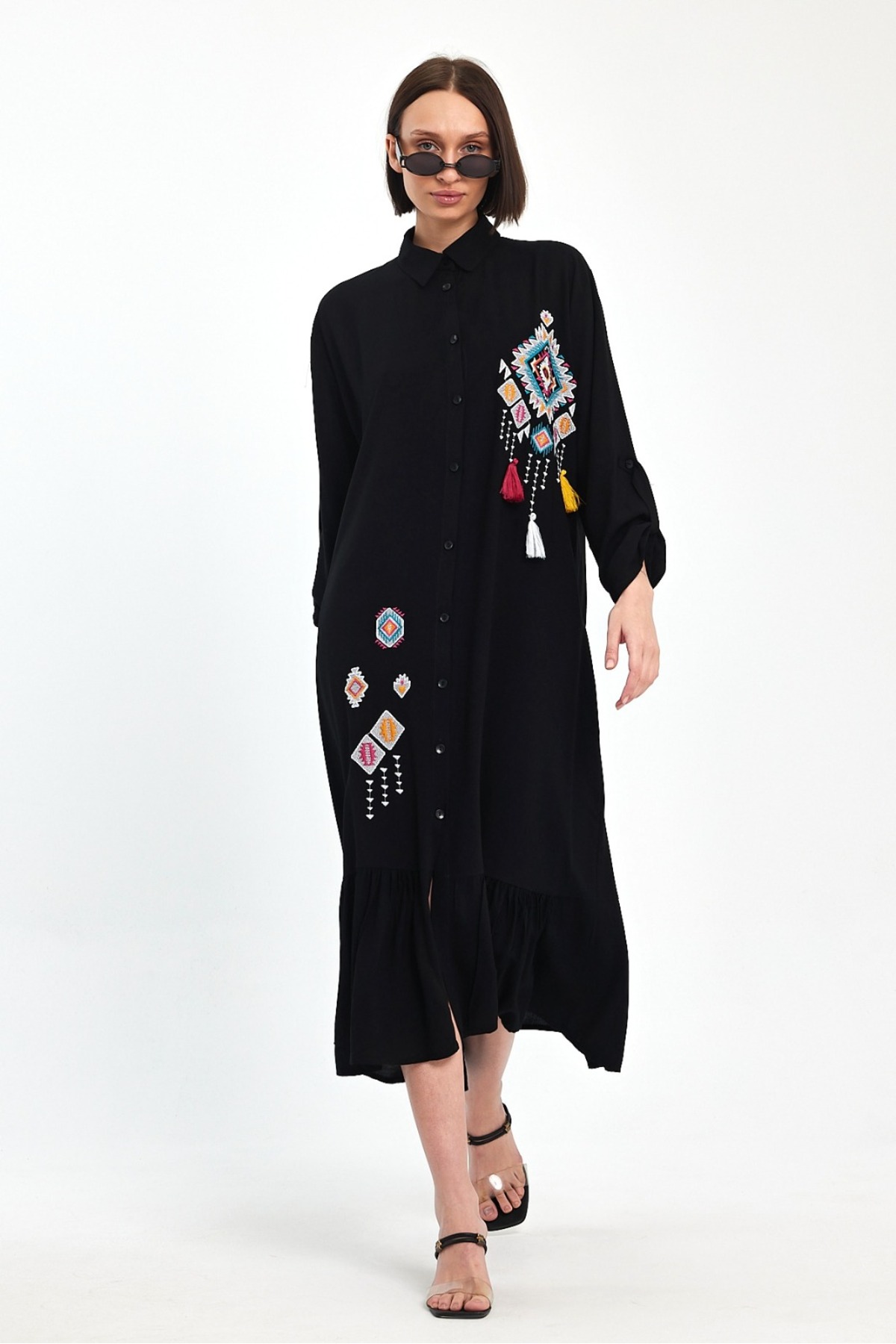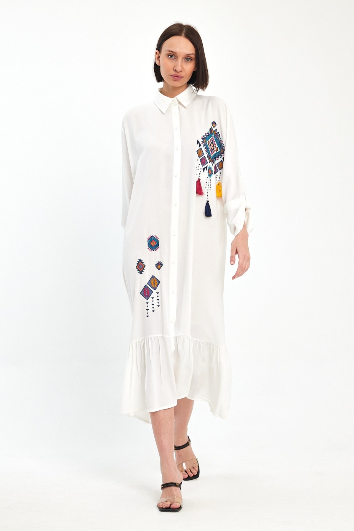 Kadın Beyaz Patlı Yakalı Etnik Nakış İşlemeli Uzun Kollu Kuşaklı Salaş Elbise Kadın Beyaz Patlı Yakalı Etnik Nakış İşlemeli Uzun Kollu Kuşaklı Salaş Elbise 181-ALA XL