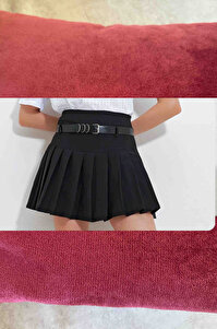 Kadın Siyah Piliseli Kemerli Şort Etek ALC-X11901 Kadın Siyah Piliseli Kemerli Şort Etek ALC-X11901 XL