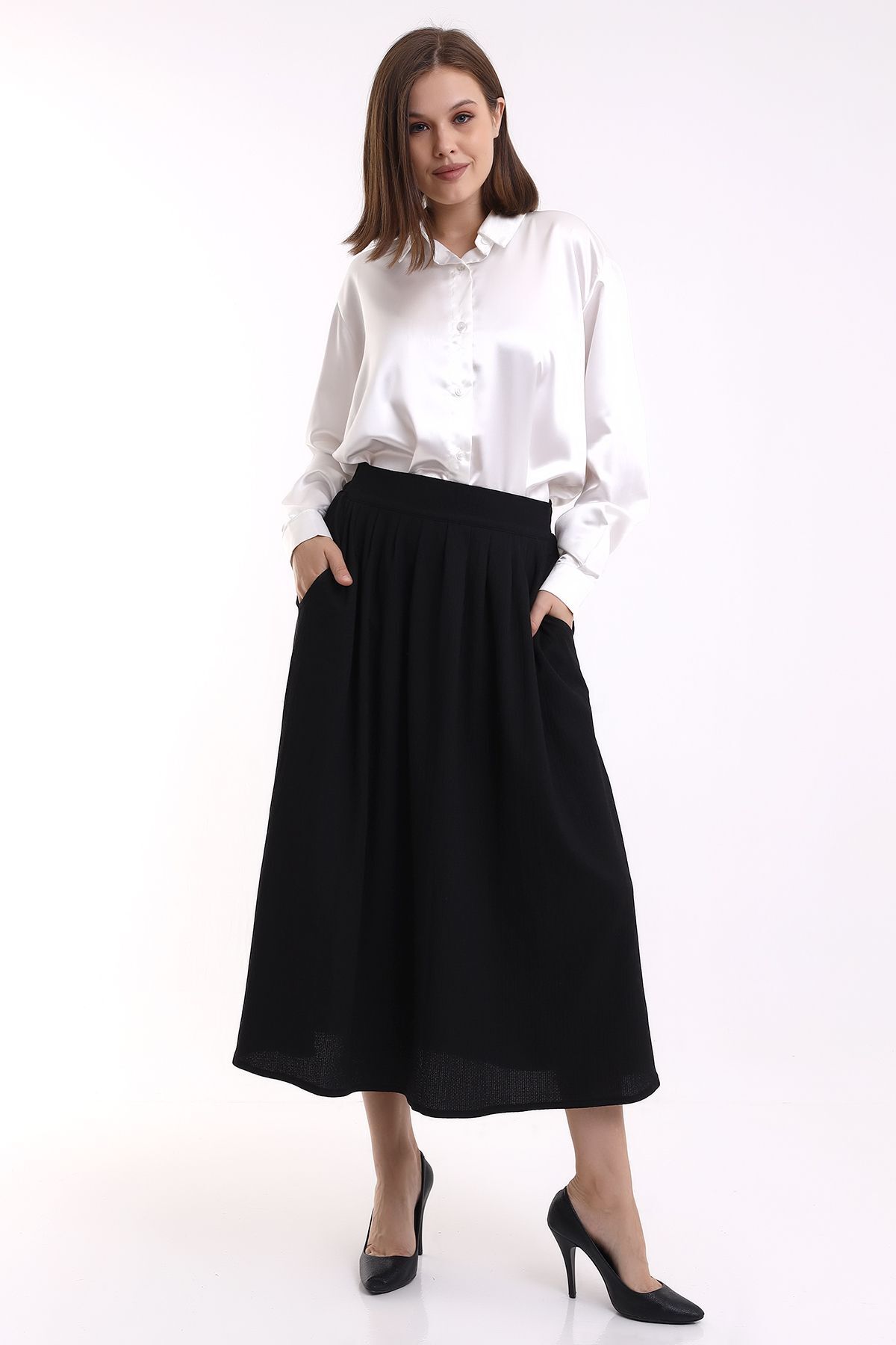 %100 Pamuk Fermuarlı Astarlı Yan Cepli Kloş Etek %100 Pamuk Fermuarlı Astarlı Yan Cepli Kloş Etek 23171 XL