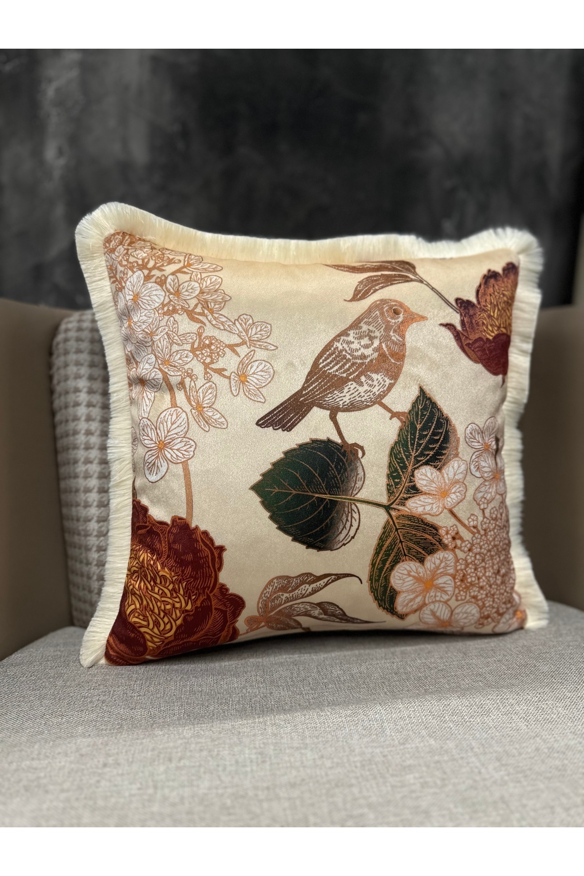 İthal İpek Kadife Krem Zemin Klasik Kuşlu PÜSKÜLLÜ KIRLENT KILIFI (Çift Taraflı Desen) İthal İpek Kadife Krem Zemin Klasik Kuşlu PÜSKÜLLÜ KIRLENT KILIFI (Çift Taraflı Desen) Blend-444-Püsküllü 43 x 43
