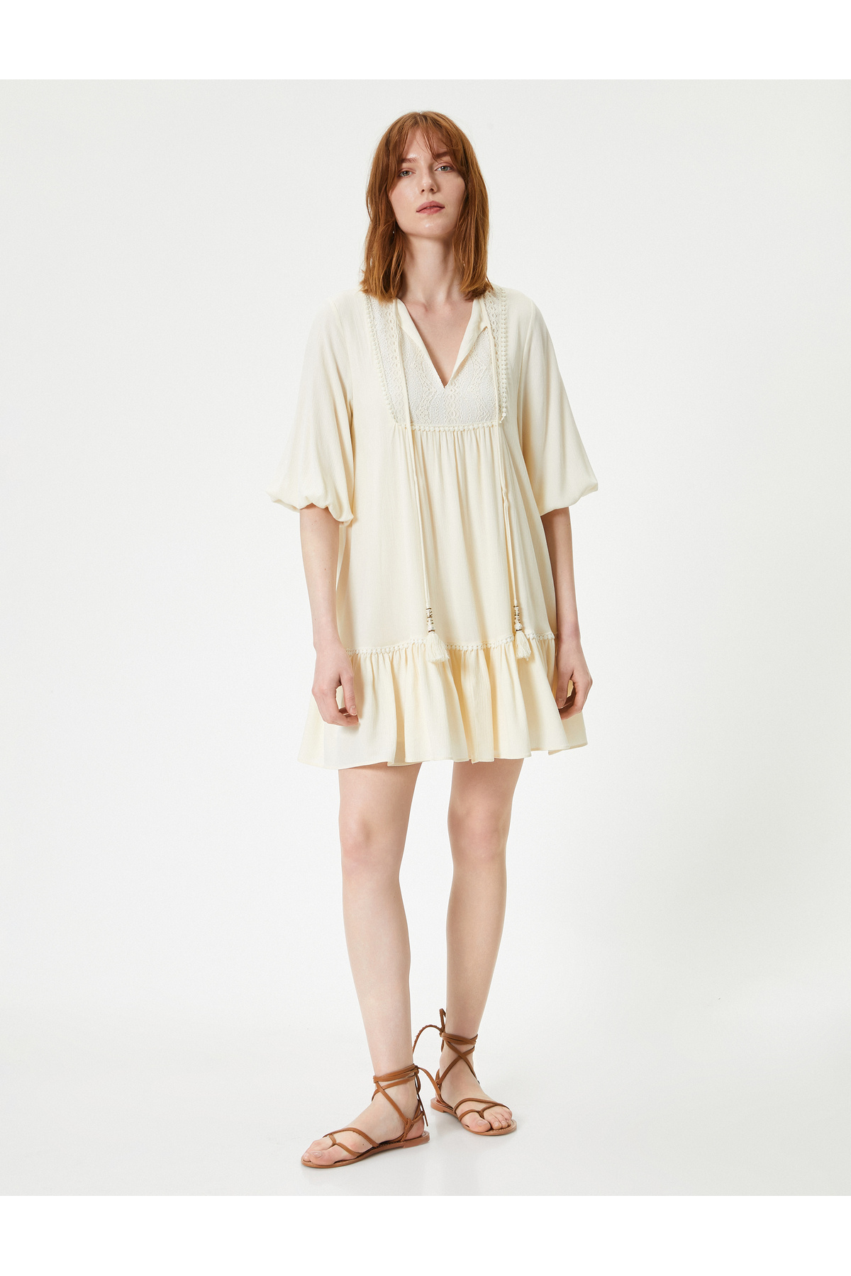 Mini Volanlı Elbise Balon Kollu Püskül Detaylı Viskon Mini Volanlı Elbise Balon Kollu Püskül Detaylı Viskon 4SAK80194EW 44