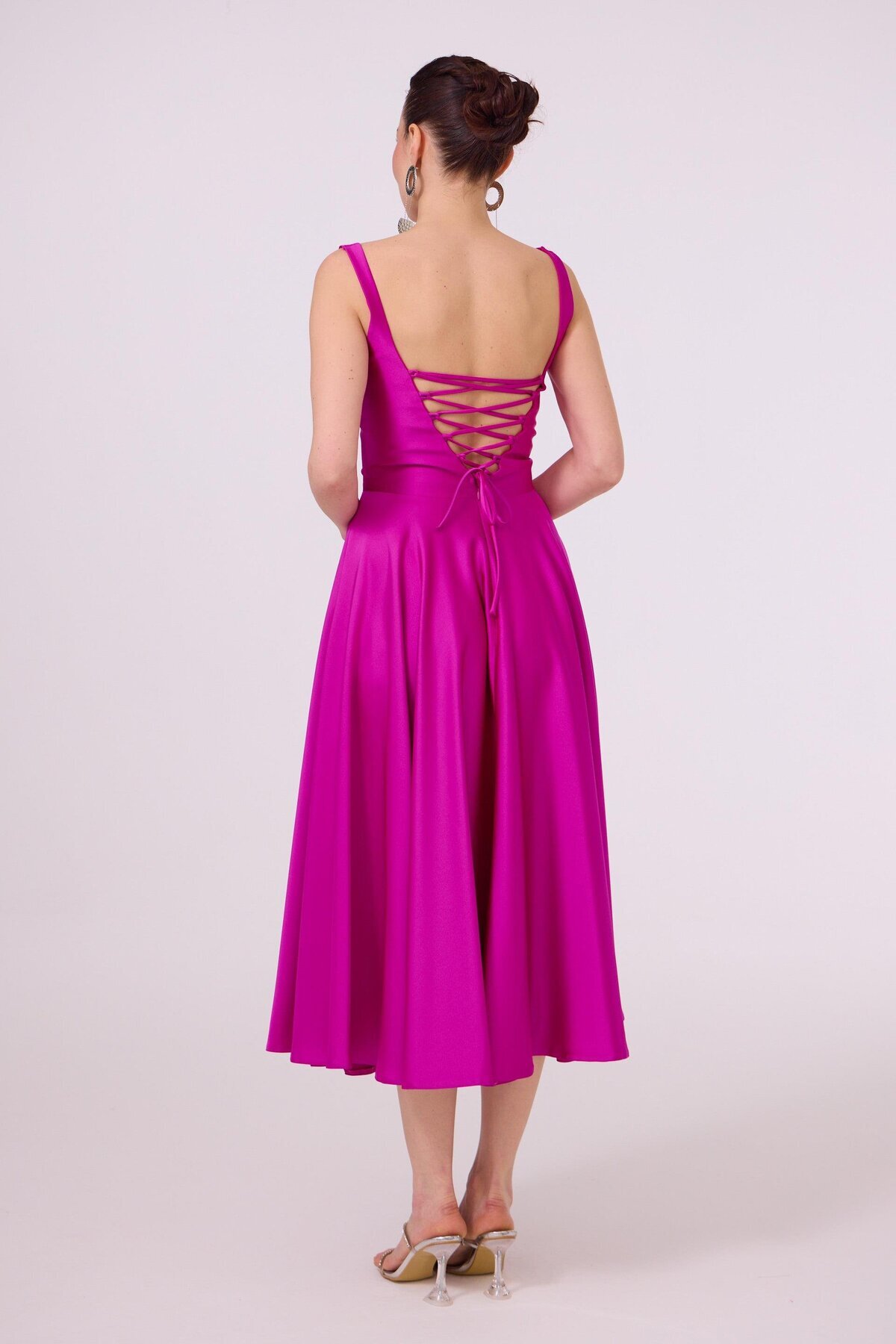 Fuşya Sırt Dekolteli Midi Saten Abiye Elbise Fuşya Sırt Dekolteli Midi Saten Abiye Elbise 58131 48