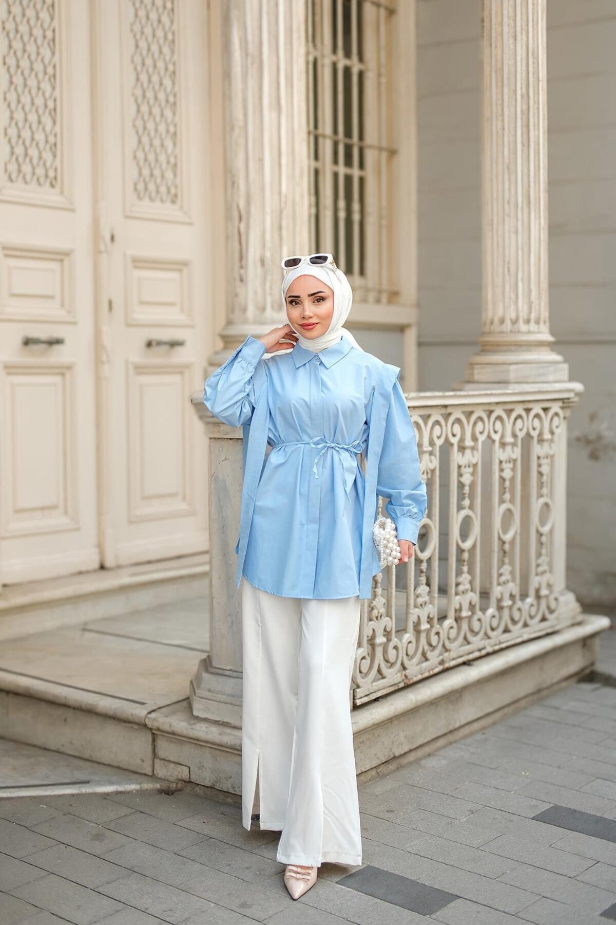 Pile Detay Önü Gizli Düğmeli Gömlek Açık Mavi Pile Detay Önü Gizli Düğmeli Gömlek Açık Mavi 182-0045 L/XL