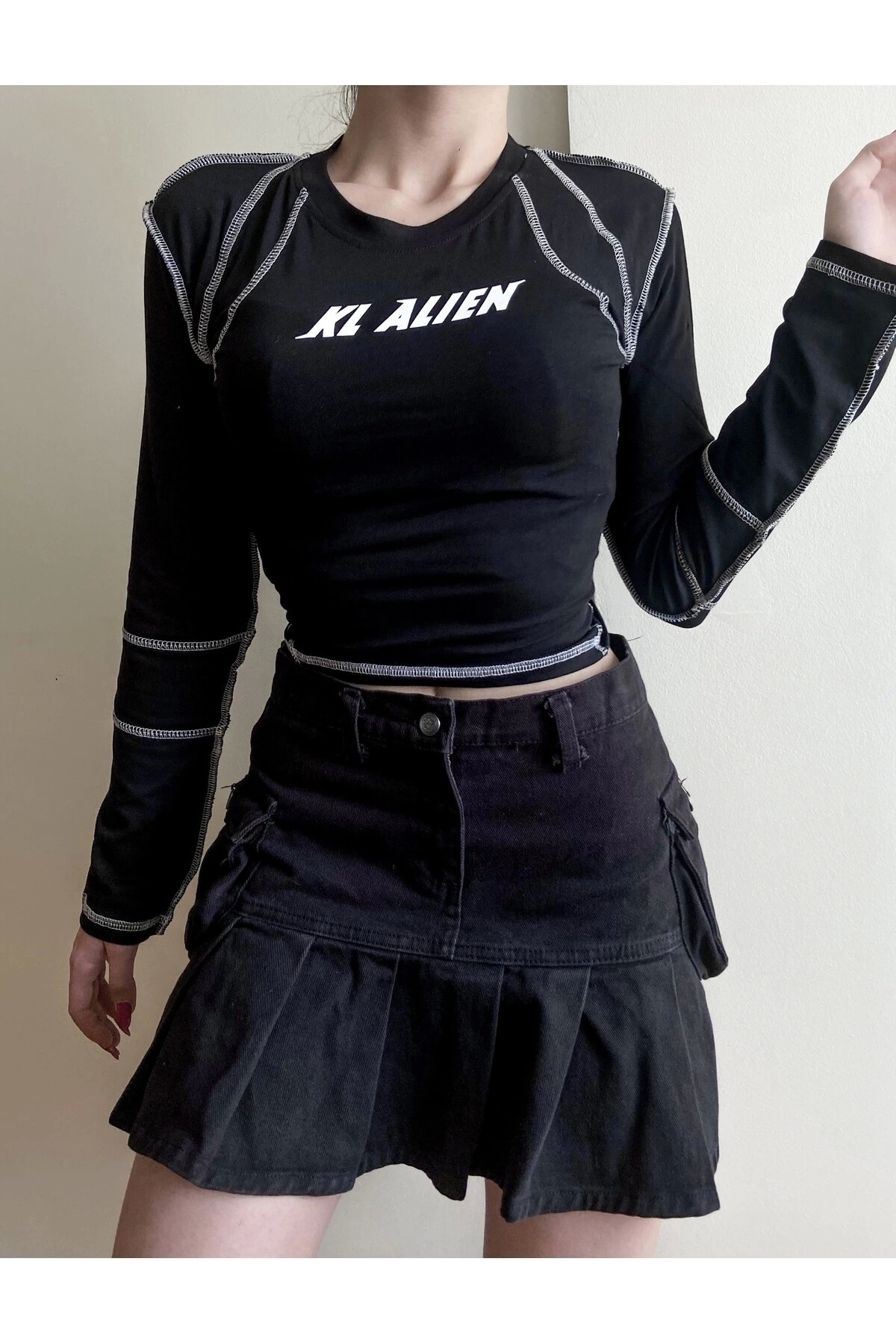 Gotik Punk Y2K Kırmızı Dikişli Omzu Açık Crop Bluz Gotik Punk Y2K Kırmızı Dikişli Omzu Açık Crop Bluz P595S129 L