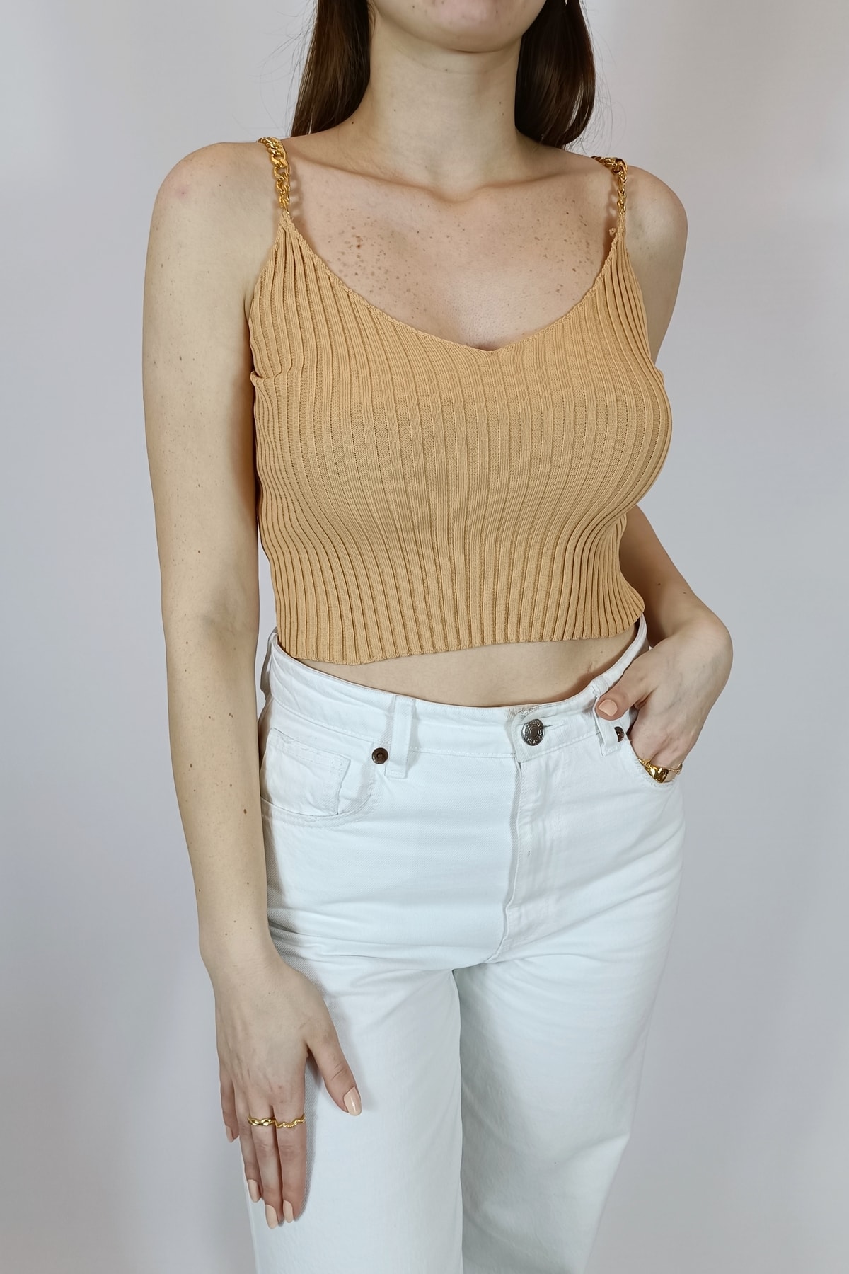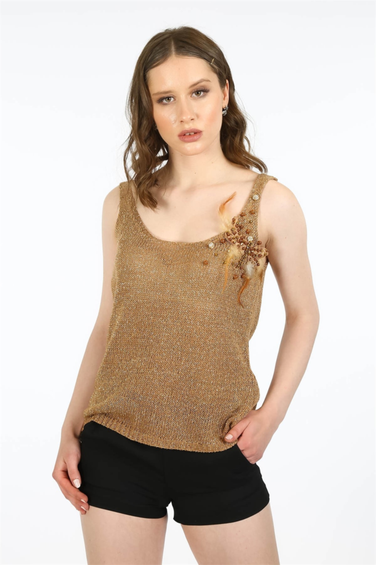 Kadın Ön Arka V Yaka Kolsuz Askılı Sim Detaylı Camel Bluz Kadın Ön Arka V Yaka Kolsuz Askılı Sim Detaylı Camel Bluz O-22113 XL
