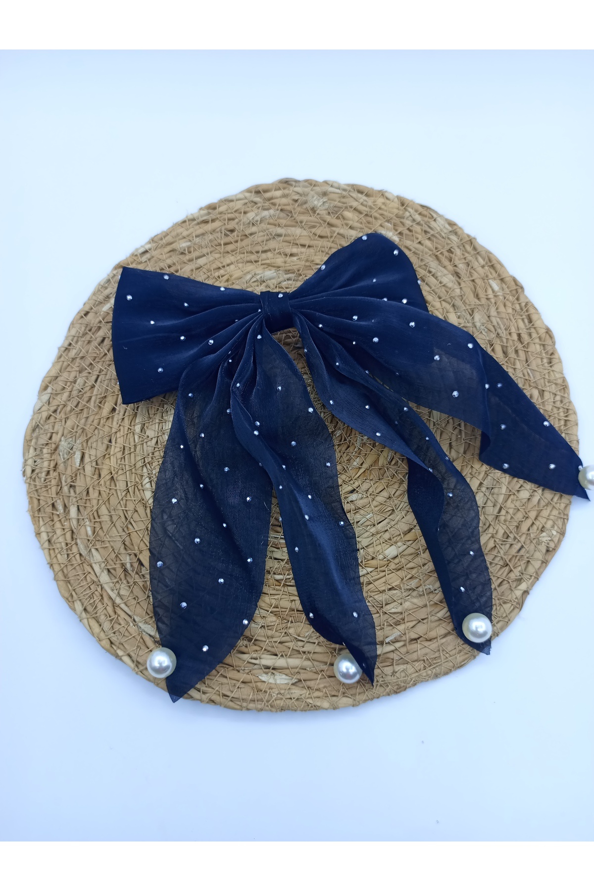 Kadın saten siyah abiye incili fiyonk otomatik klips toka Kadın saten siyah abiye incili fiyonk otomatik klips toka تک سایز