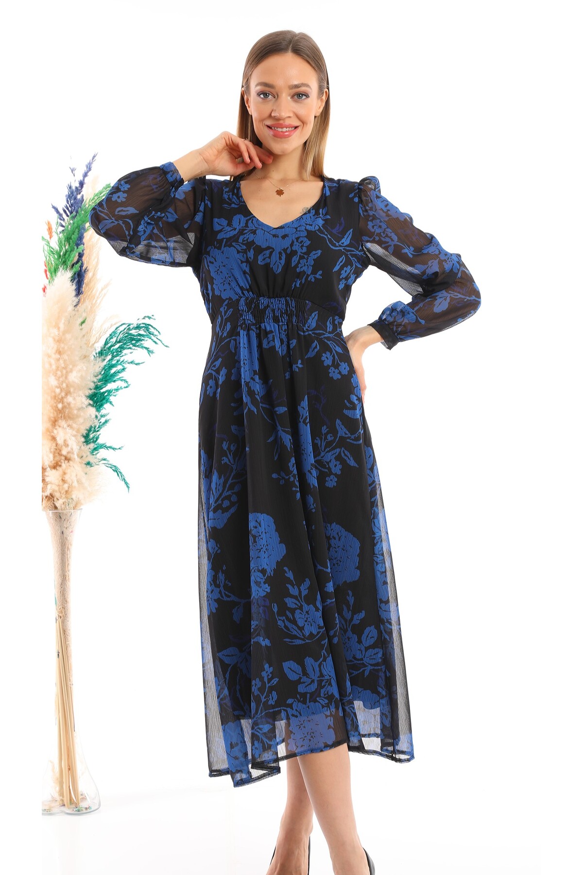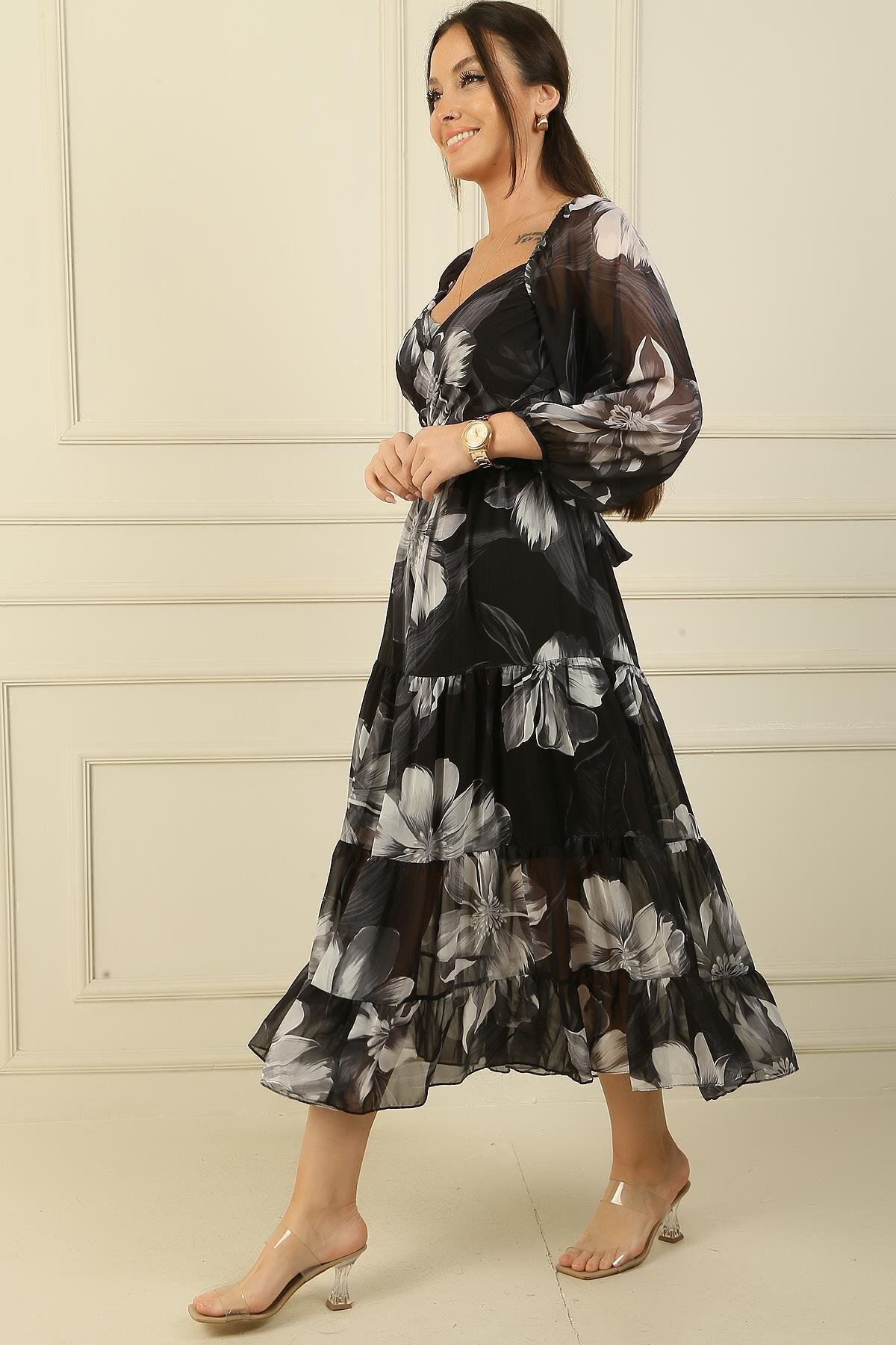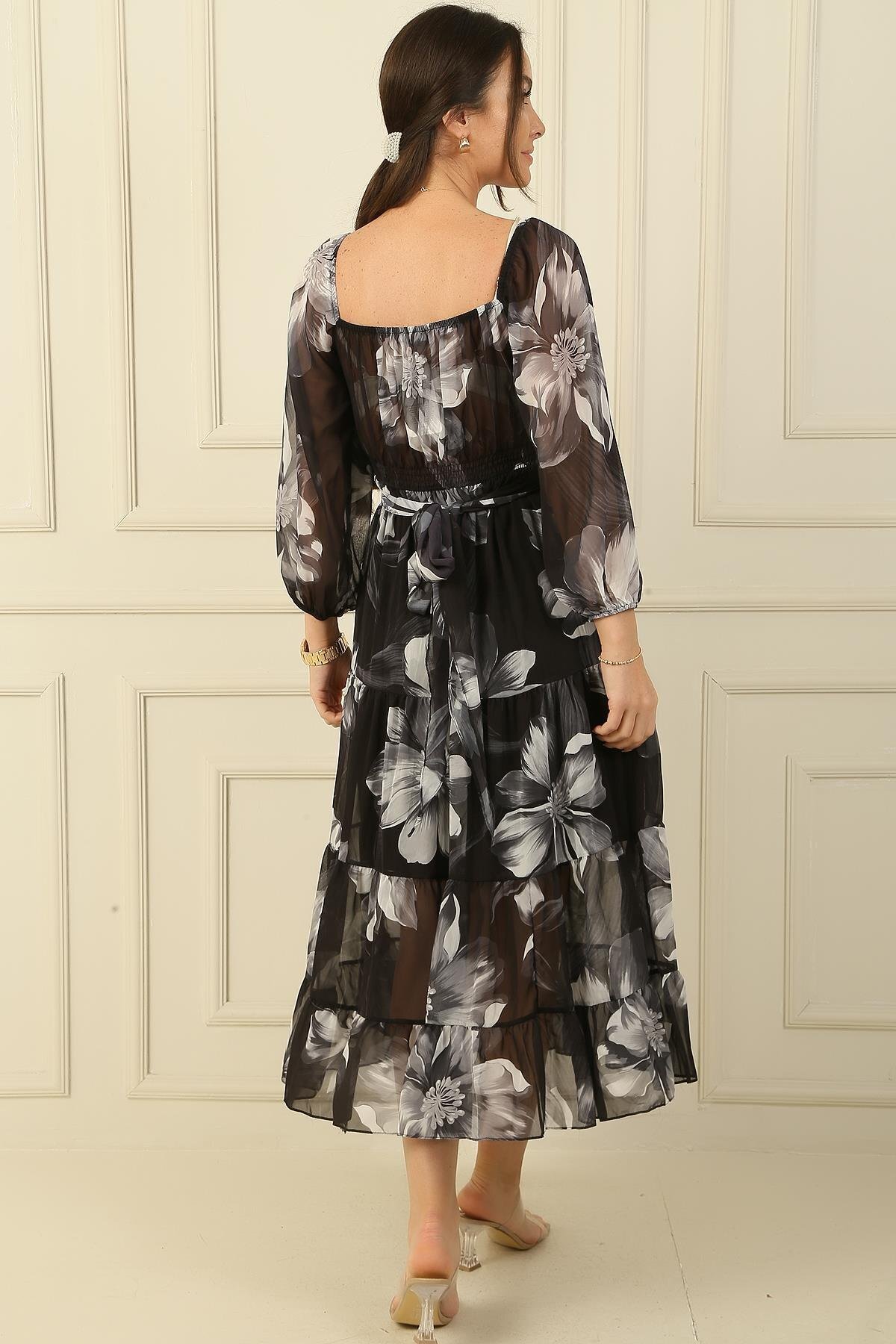Madonna Yaka Astarlı Çapraz Bağlamalı Çiçekli Kruvaze Şifon Elbise Madonna Yaka Astarlı Çapraz Bağlamalı Çiçekli Kruvaze Şifon Elbise S-24K0840005 XL
