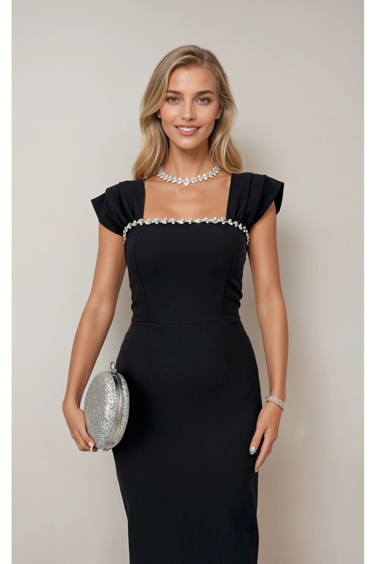 Siyah Saten Kumaş Taş Detaylı Kuyruklu Maxi Boy Abiye Elbise Siyah Saten Kumaş Taş Detaylı Kuyruklu Maxi Boy Abiye Elbise DFX582897 L