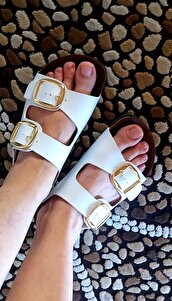 Kadın Beyaz Cilt Gold Toka Çift Bantlı Ayarlanabilir Tokalı Günlük Terlik Kadın Beyaz Cilt Gold Toka Çift Bantlı Ayarlanabilir Tokalı Günlük Terlik EMR5003 41