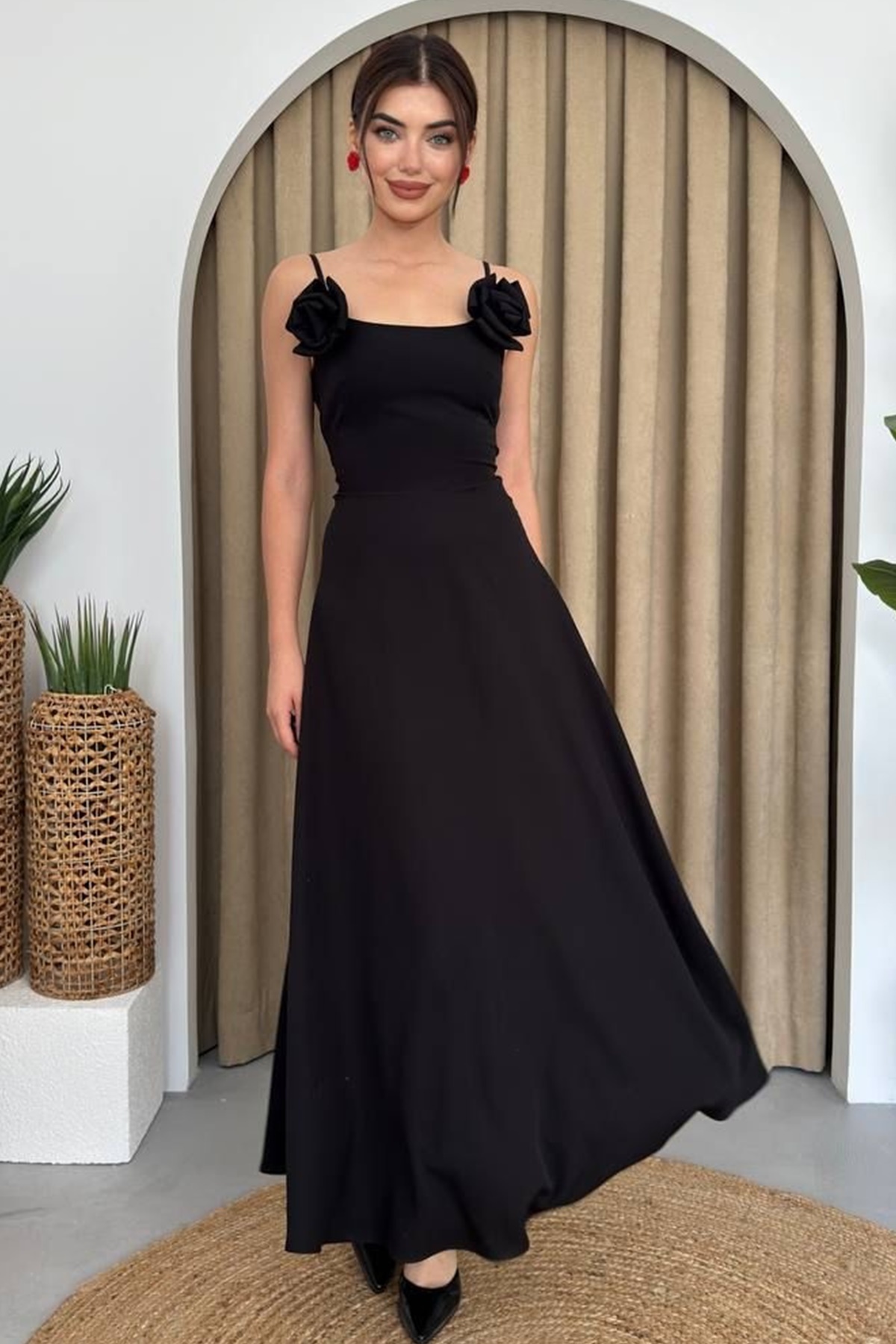 Kadın Atlas Kumaş Straplez Yaka Gül Aksesuar Tasarımlı Askılı Siyah Maxi Abiye Elbise 258 Kadın Atlas Kumaş Straplez Yaka Gül Aksesuar Tasarımlı Askılı Siyah Maxi Abiye Elbise 258 BS-ETC-258 XL