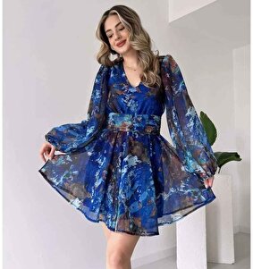 Renkli Beli Lastikli Volanlı Astarlı Şifon Mini Elbise Renkli Beli Lastikli Volanlı Astarlı Şifon Mini Elbise mirkar793-2831- XL