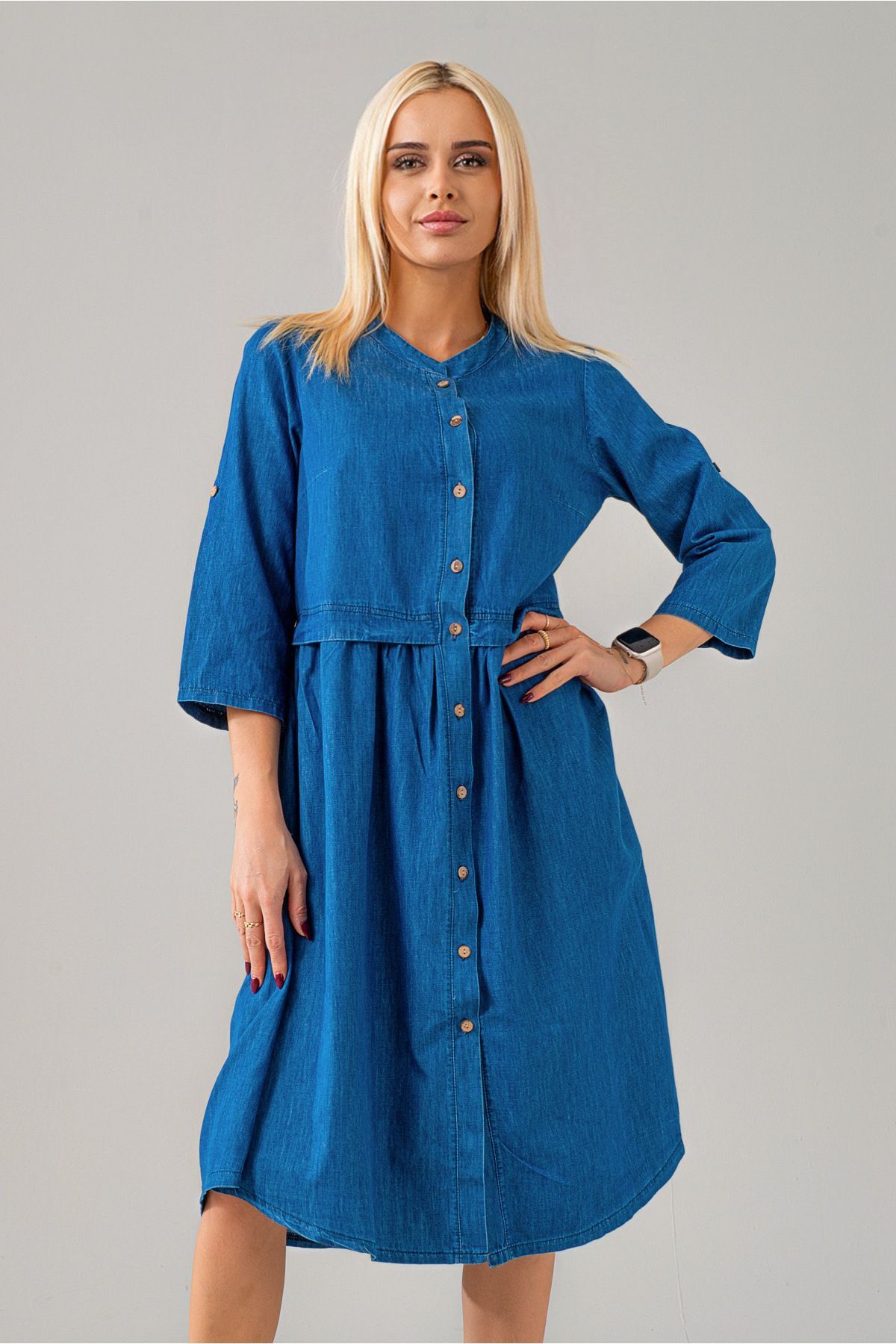 Kadın İndigo Yarım Pat Düğmeli Kolsuz Hakim Yaka Cepli İnce Kot Elbise Kadın İndigo Yarım Pat Düğmeli Kolsuz Hakim Yaka Cepli İnce Kot Elbise 4275 3XL