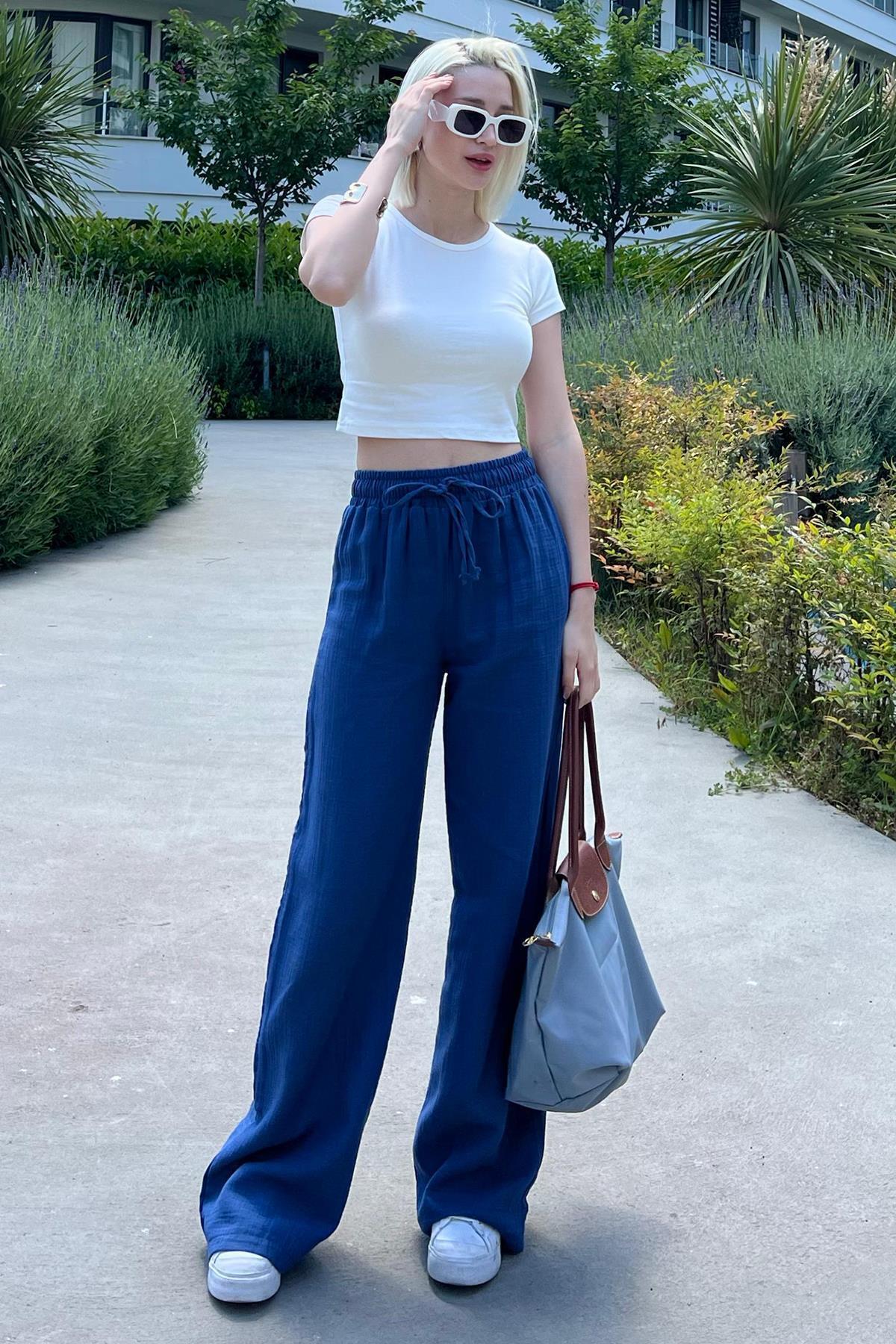 Koyu Mavi Bol Paça Müslin Kadın Pantolon MG1980 Koyu Mavi Bol Paça Müslin Kadın Pantolon MG1980 XL