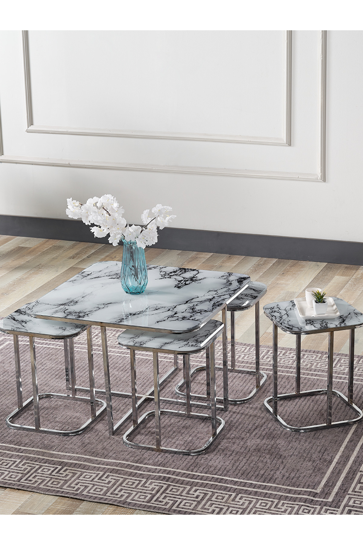 5 Li 4 1 Beyaz Mermer Temperli Cam Gümüş Metal Ayak Takım Sehpa Orta Sehpa Bohem 5 Li 4 1 Beyaz Mermer Temperli Cam Gümüş Metal Ayak Takım Sehpa Orta Sehpa Bohem PLKN-003 تک سایز