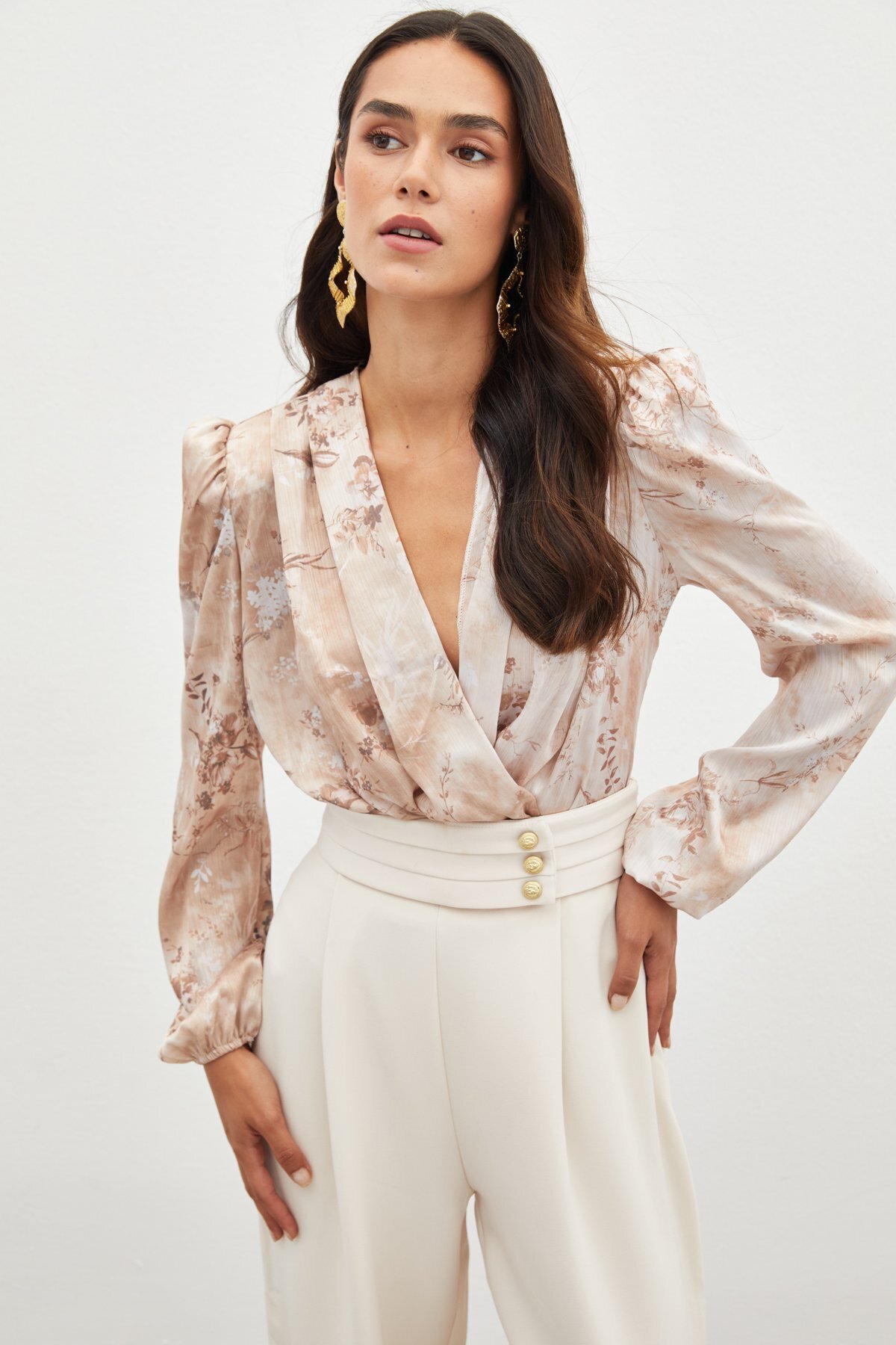 Çift Desenli Kruvaze Bodysuit Bluz - VİZON Çift Desenli Kruvaze Bodysuit Bluz - VİZON STN139KBL1460 42