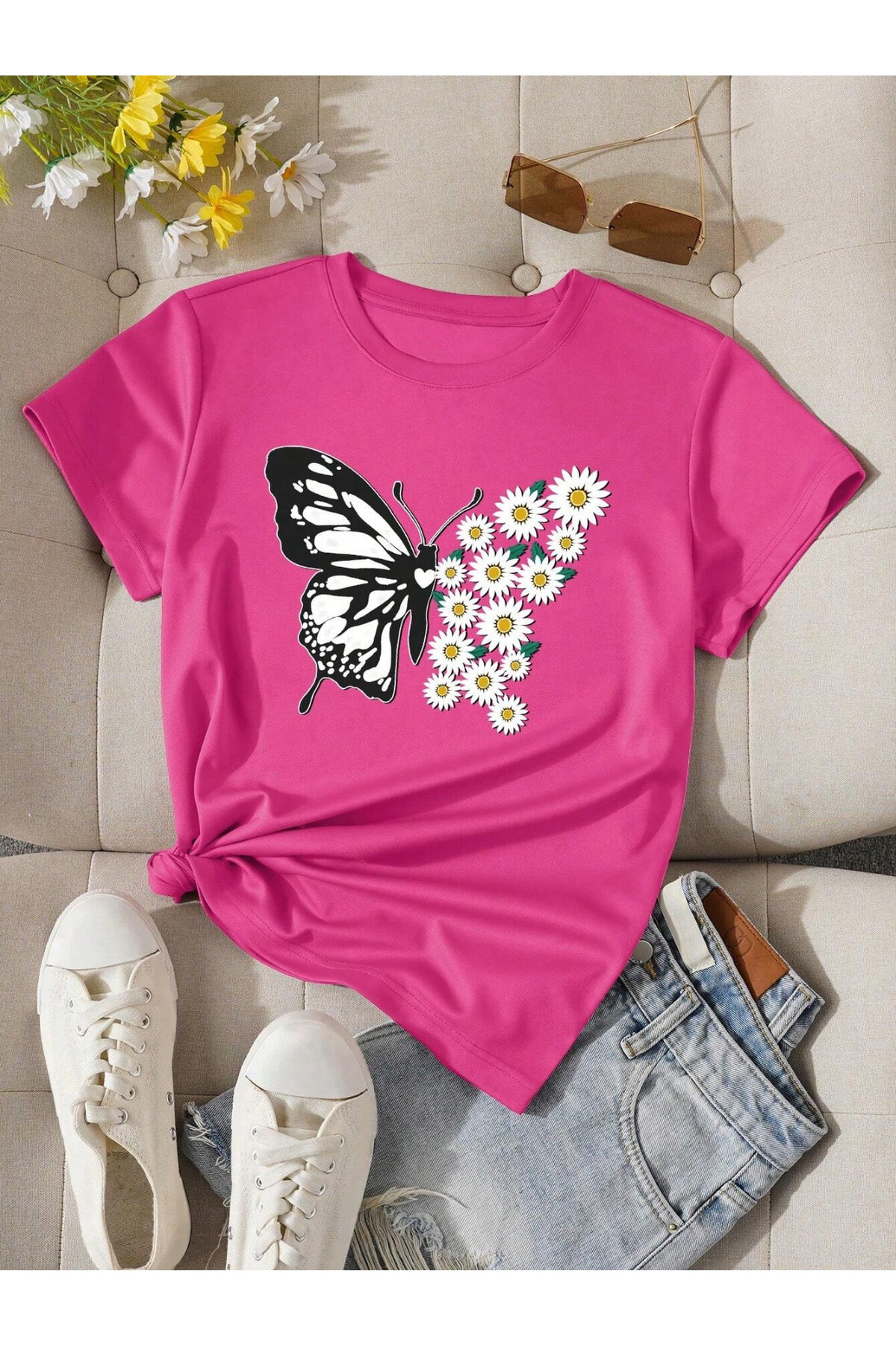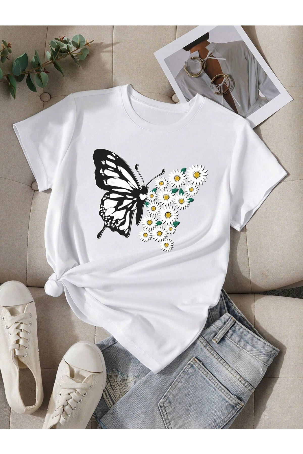 Kadın Kelebek Baskılı Oversize Penye T-shirt Tişört Kadın Kelebek Baskılı Oversize Penye T-shirt Tişört 6XL