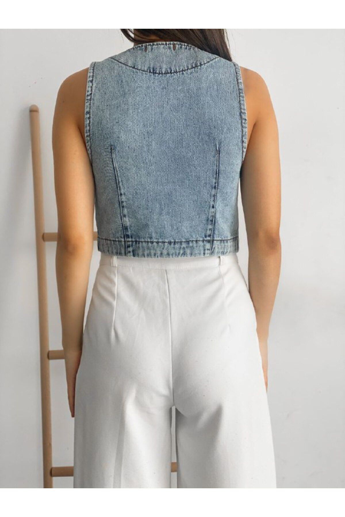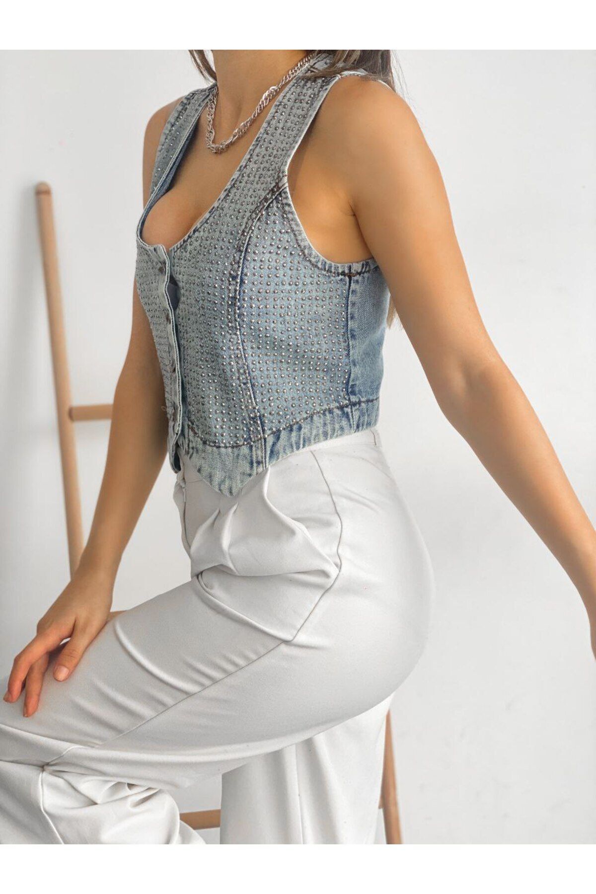 OREO Kadın Parlak Zımba Taşlı Kot Yelek OREO Kadın Parlak Zımba Taşlı Kot Yelek 5525 L