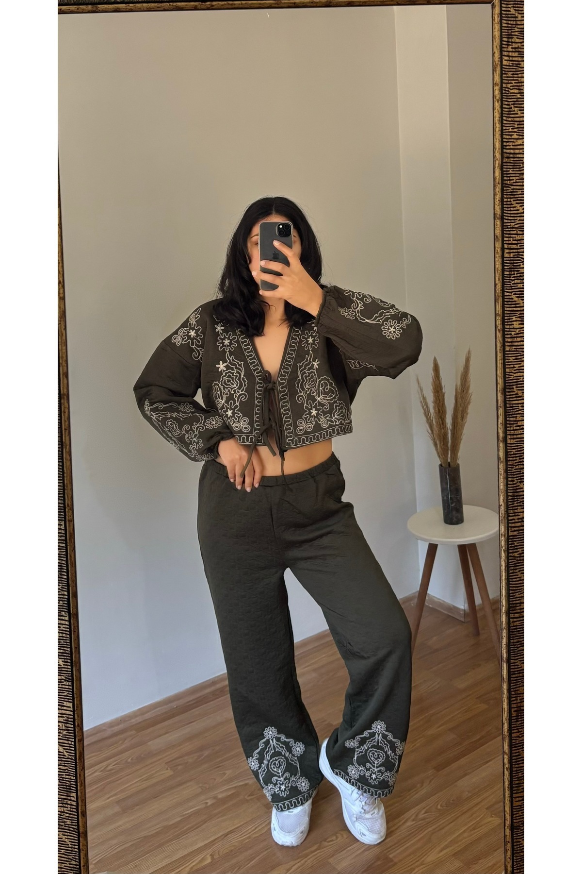 Kadın İşlemeli Güpürlü Keten Crop Şort Takım Kadın İşlemeli Güpürlü Keten Crop Şort Takım HB-DM-TKM6 L