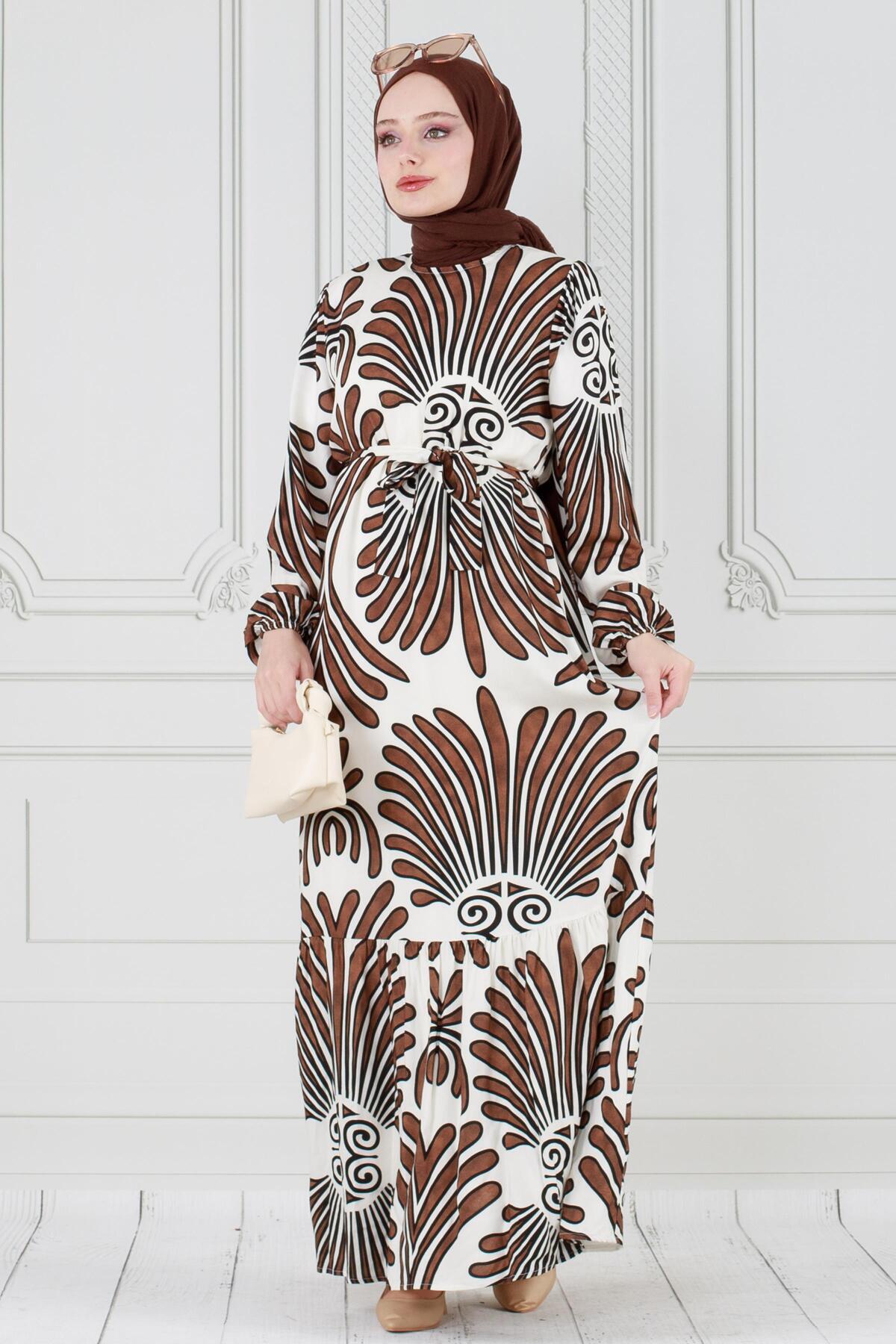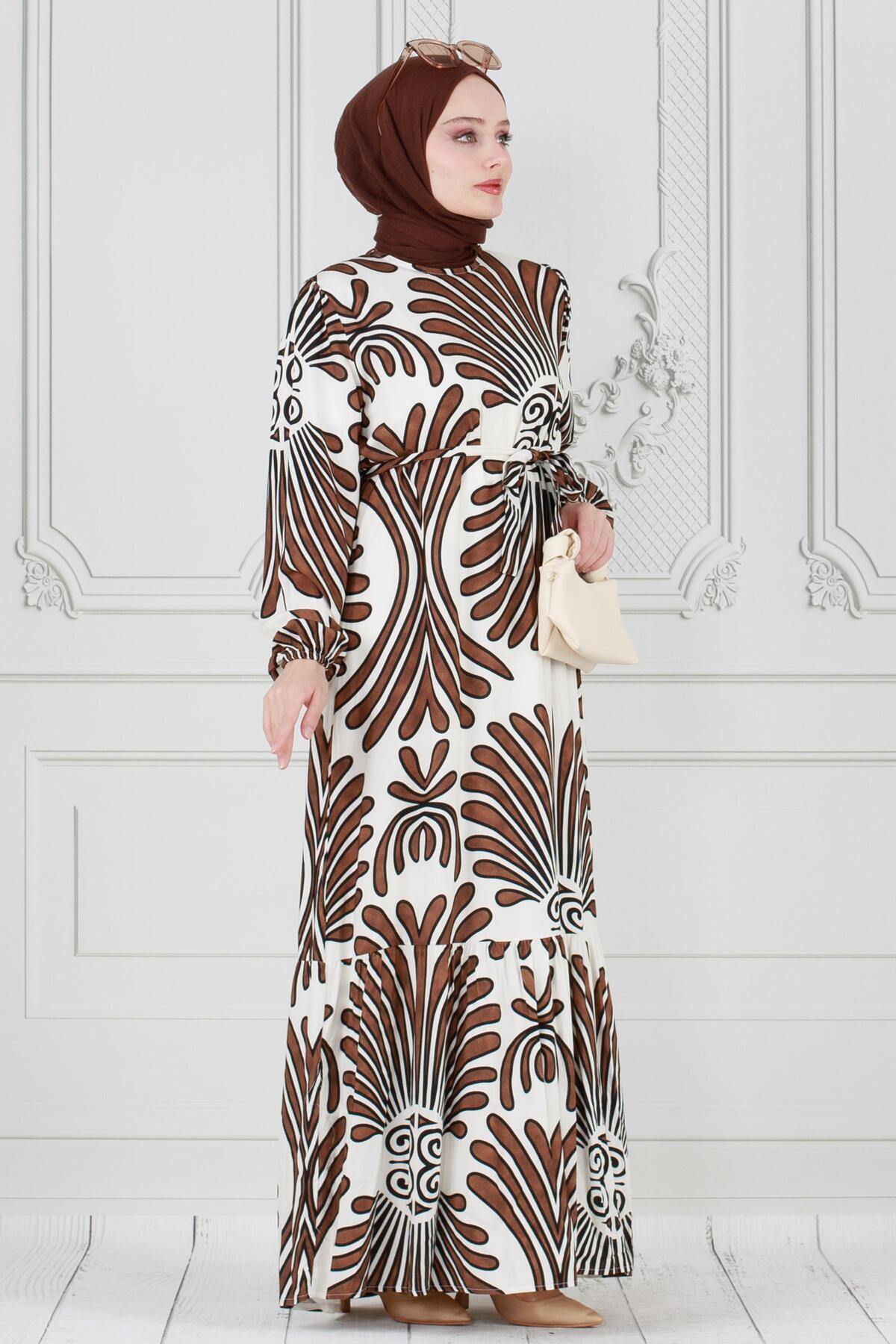 Neva Beli Kuşaklı Viscon Elbise-Kahverengi Neva Beli Kuşaklı Viscon Elbise-Kahverengi SVT2585 52