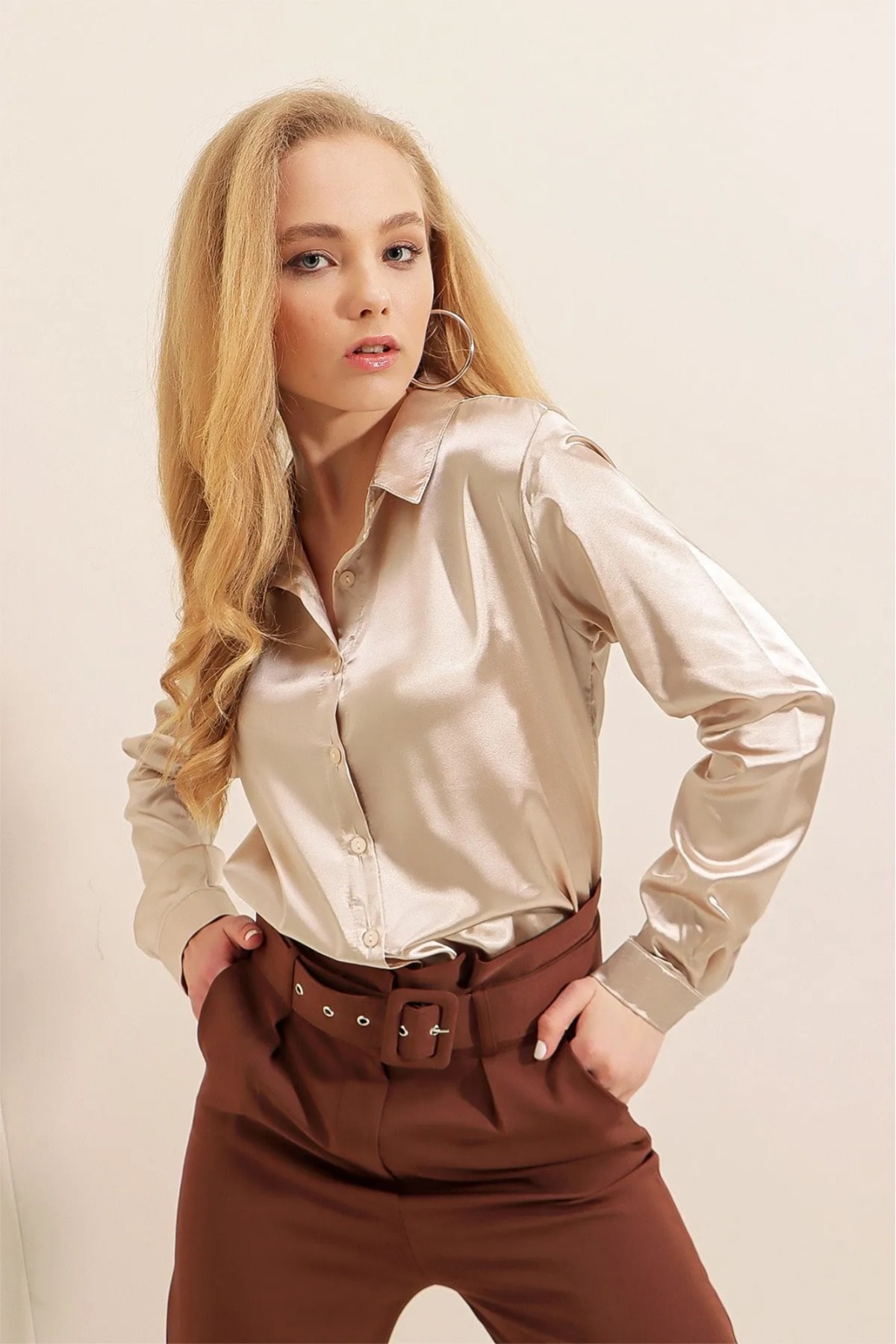 Hafif Dökümlü Saten Gömlek Hafif Dökümlü Saten Gömlek 1988111100001810 44