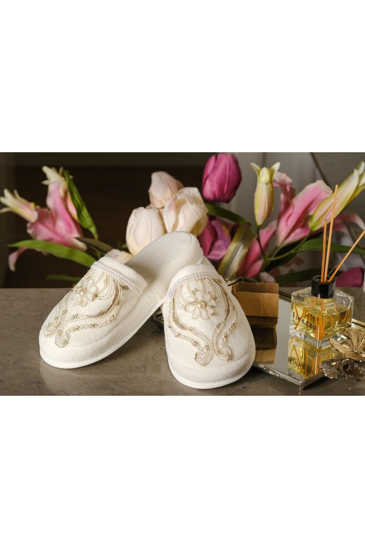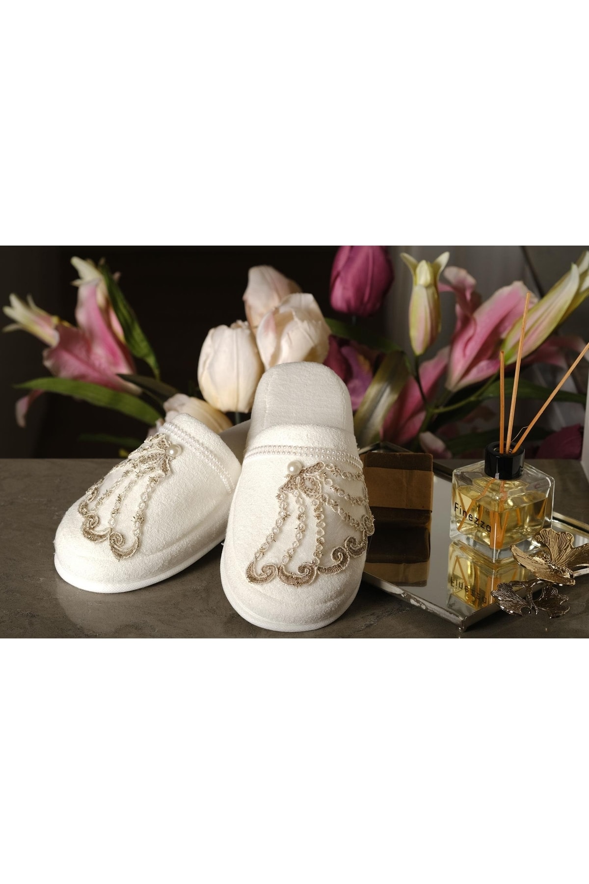 Lüks tasarım standart gelin doğum lohusa havlu terlik incili broşlu kadın terliği kahverengi çiçekli Lüks tasarım standart gelin doğum lohusa havlu terlik incili broşlu kadın terliği kahverengi çiçekli 2405202497 تک سایز