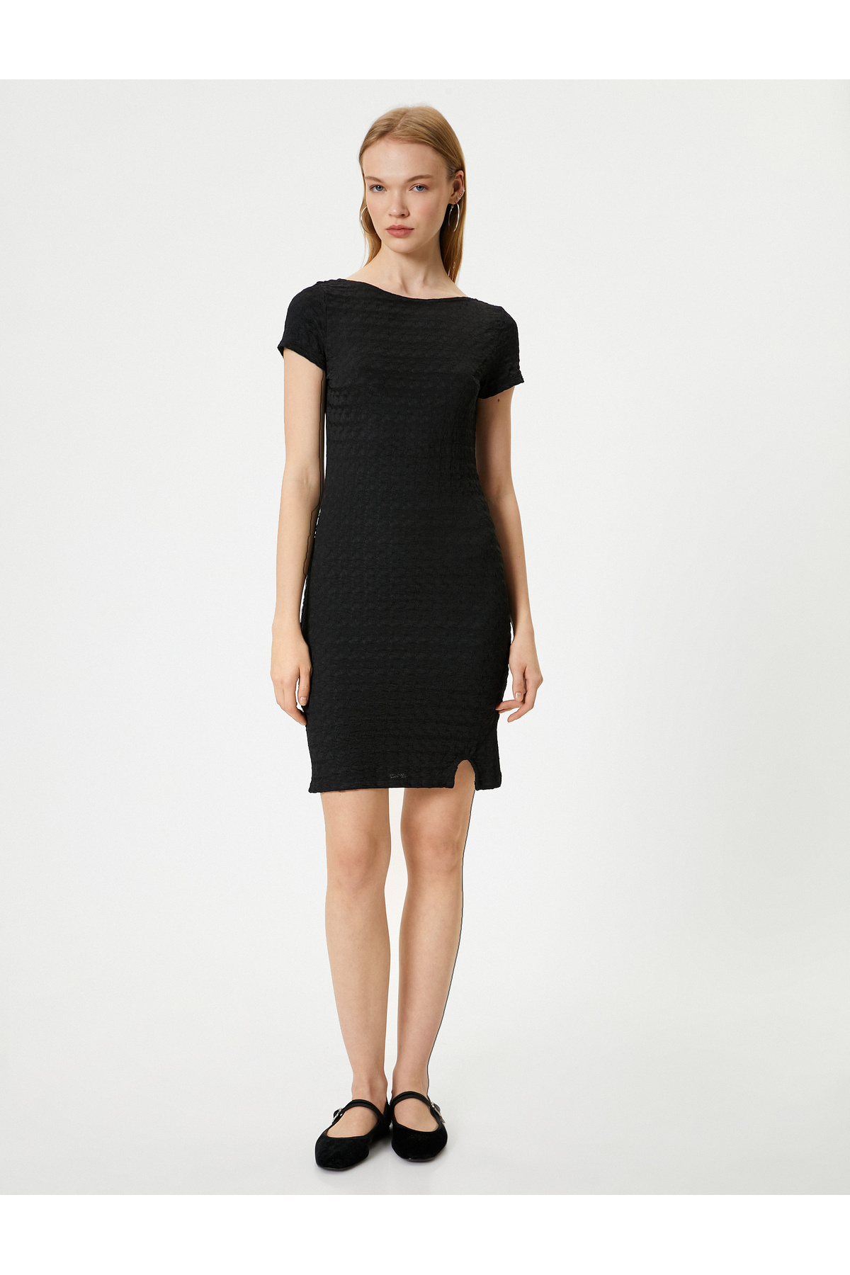 Mini Elbise Kayık Yaka Dokulu Yırtmaç Detaylı Kısa Kollu Slim Fit Bürümcük Mini Elbise Kayık Yaka Dokulu Yırtmaç Detaylı Kısa Kollu Slim Fit Bürümcük 4SAL80199IK L