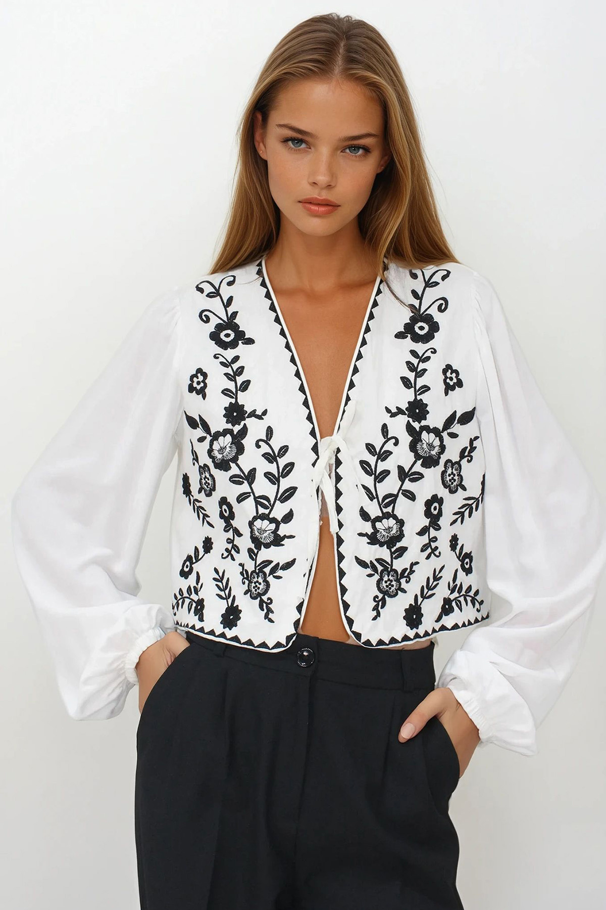 Kadın Siyah Püsküllü Bağlamalı Komple Nakışlı Balon Kol İnce Ceket Kadın Siyah Püsküllü Bağlamalı Komple Nakışlı Balon Kol İnce Ceket 5541 L