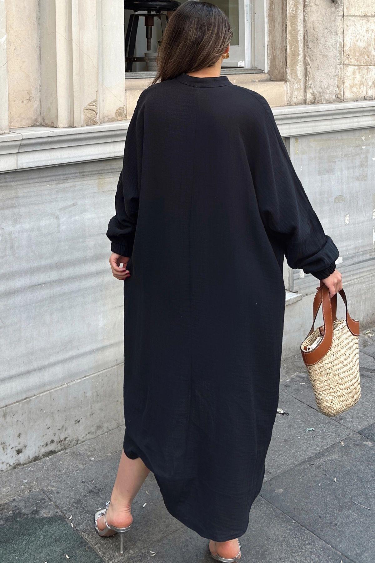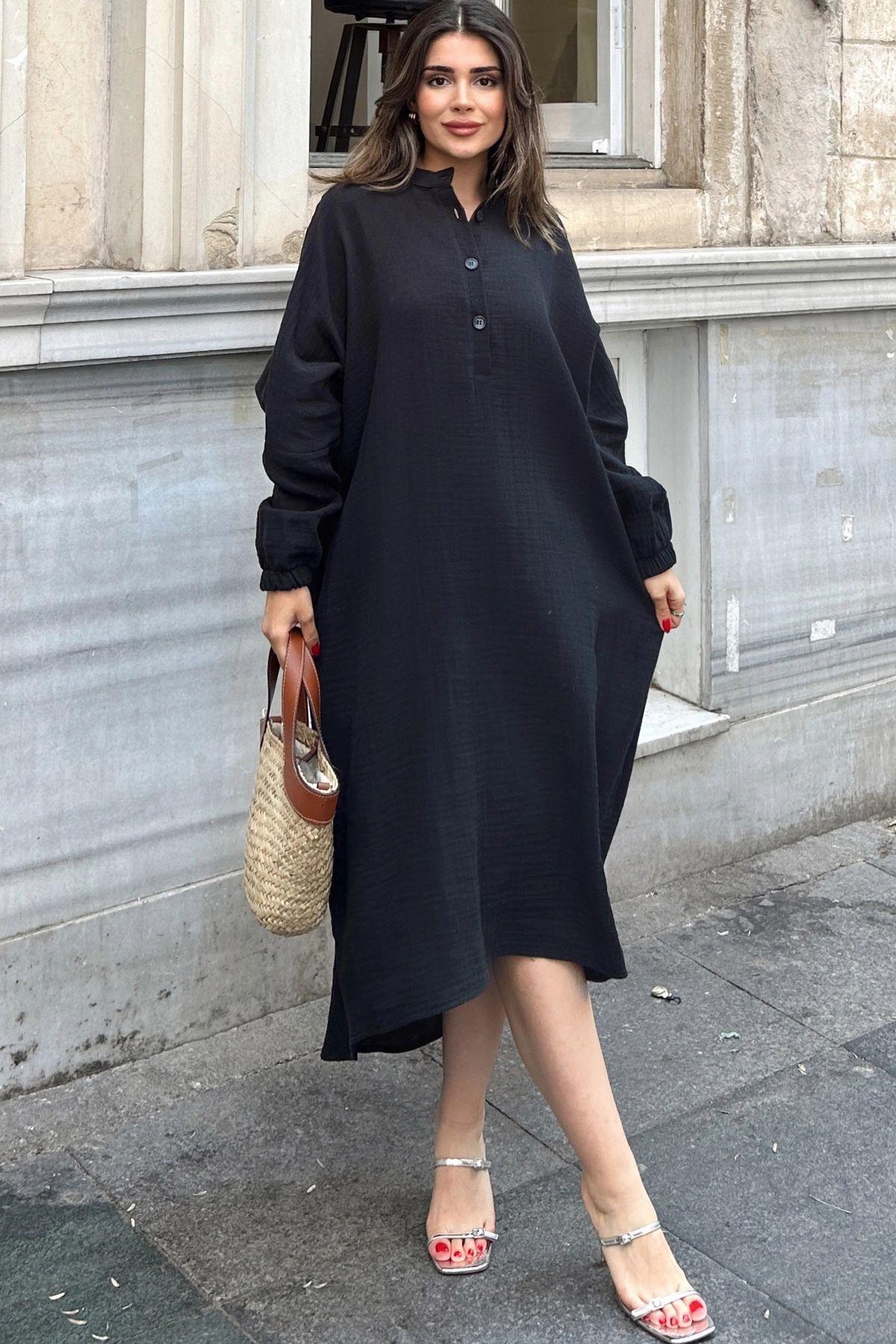 Kadın Siyah Balon Kol, Hakim Yaka, Terletmez Pamuklu, İthal Müslin Kumaş, Uzun Salaş Elbise Kadın Siyah Balon Kol, Hakim Yaka, Terletmez Pamuklu, İthal Müslin Kumaş, Uzun Salaş Elbise NY3515 42