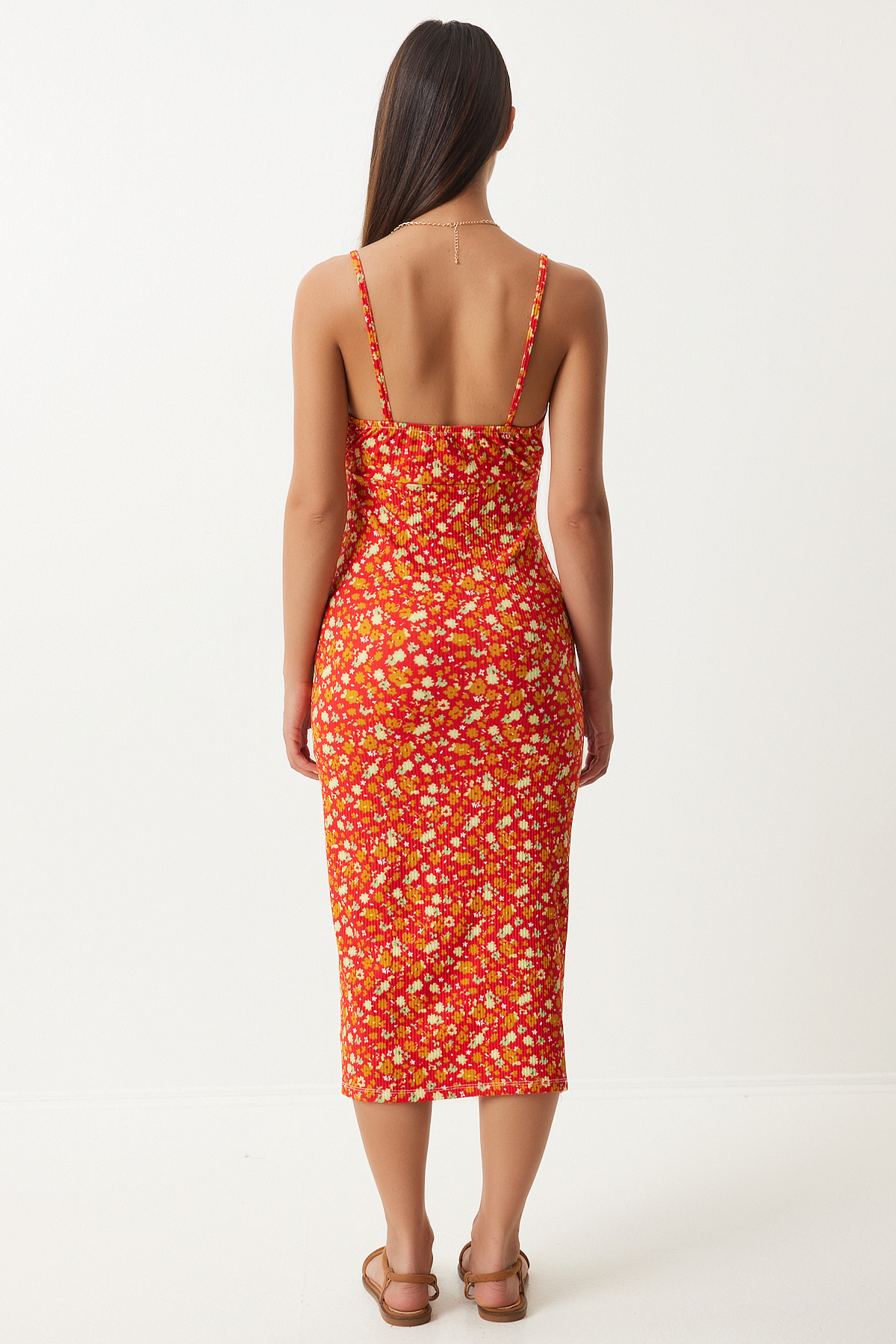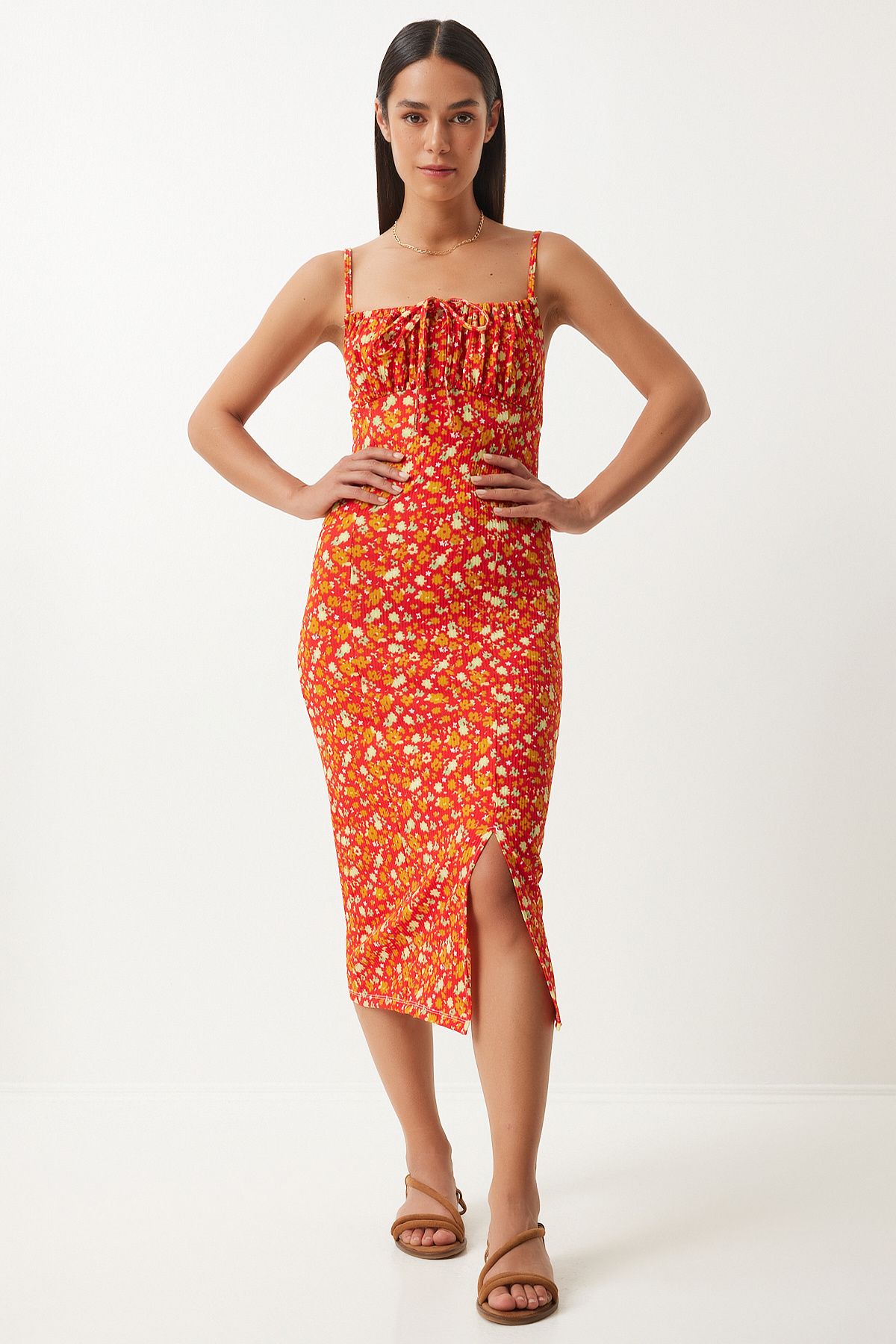 Çiçekli Desenli Yırtmaçlı Yazlık Örme Elbise KOYU ORANJ LCI0003 Çiçekli Desenli Yırtmaçlı Yazlık Örme Elbise KOYU ORANJ LCI0003 42
