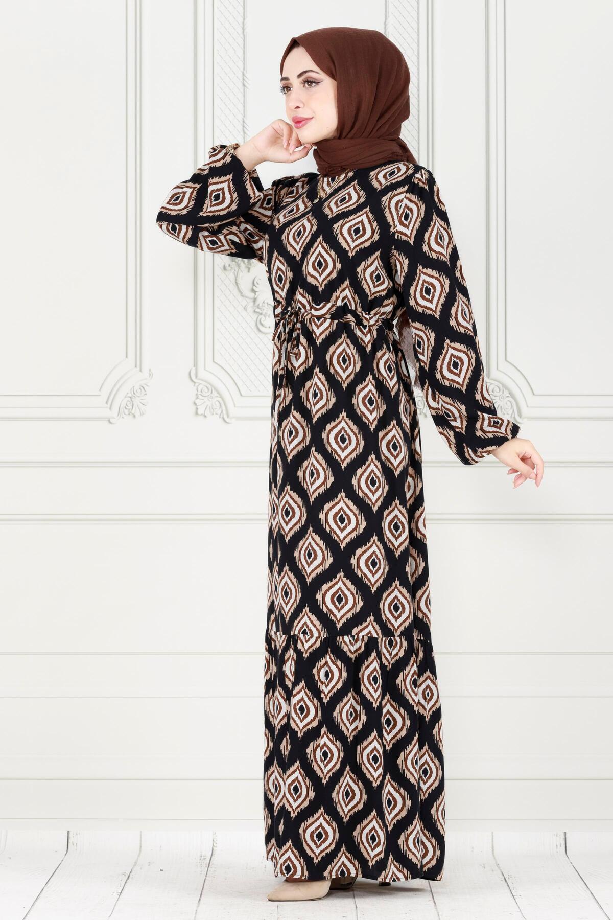 Eteği Fırfır İkat Desen Viscon Elbise-Siyah Eteği Fırfır İkat Desen Viscon Elbise-Siyah SVT2595 52